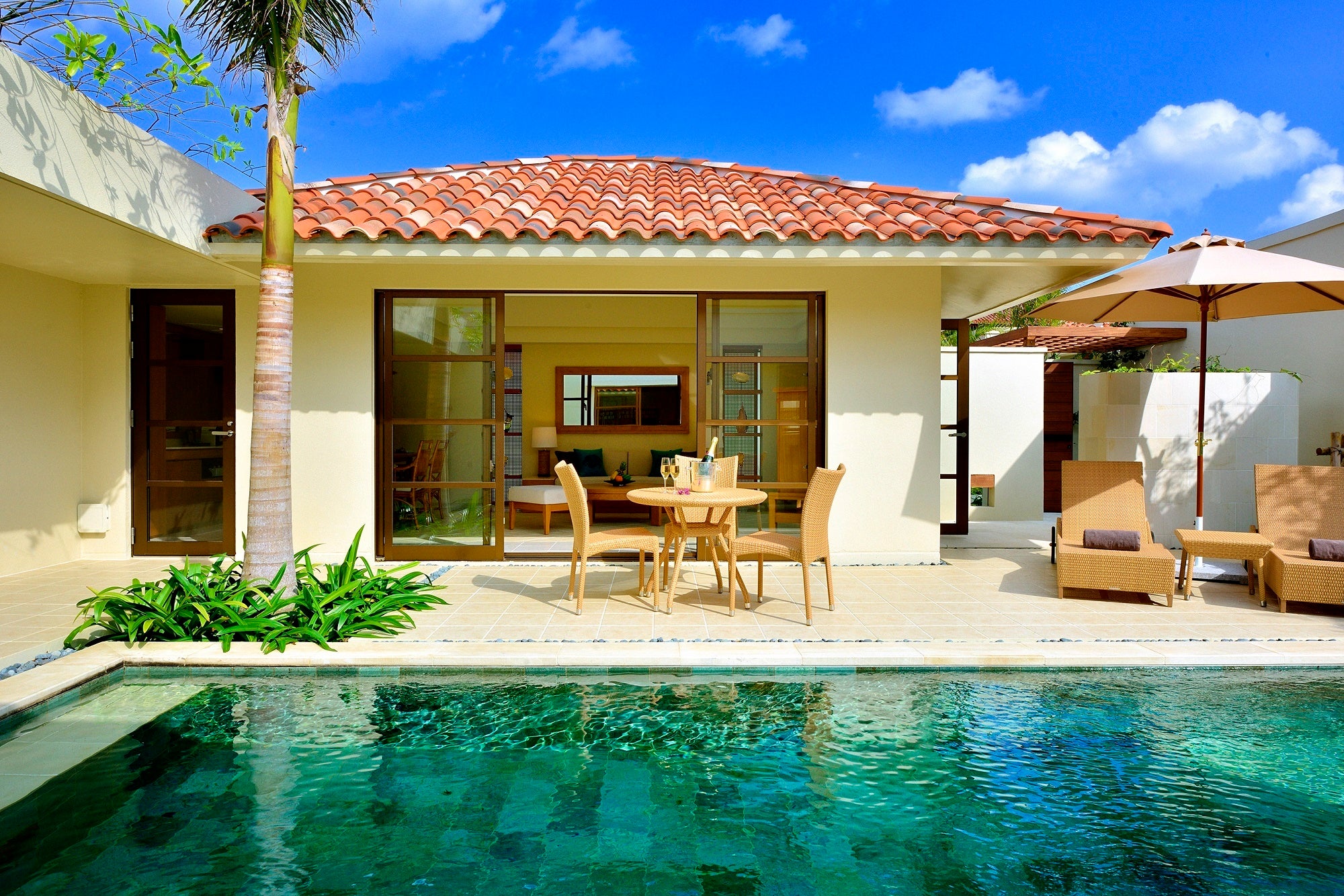 読谷村の海辺に佇む全室プール付きのプライベートヴィラ。自家農園の恵みや地元食材を使った美食、洗練されたもてなしと壮大なサンセット。ご家族やパートナーと思い思いの時間をお過ごしいただける、贅沢な空間が広がります。