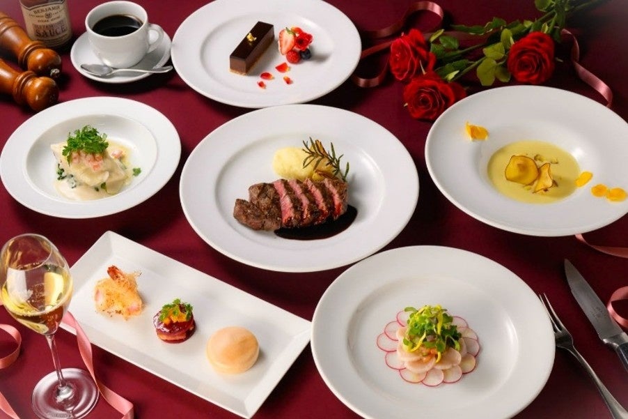 京都らしく最中に芳醇なフォアグラを入れ込んだアミューズとして「フォアグラの最中/ビーツサンド/海老のカダイフ巻き」や、USDA認定の最高位プライムグレードのフィレミニョンの旨みを凝縮させた「熟成フィレミニョンステーキ 赤ワインソース」、上品なカカオの風味と甘みを感じる「シェフ特性自家製バレンタインチョコレートケーキ」などが登場します。