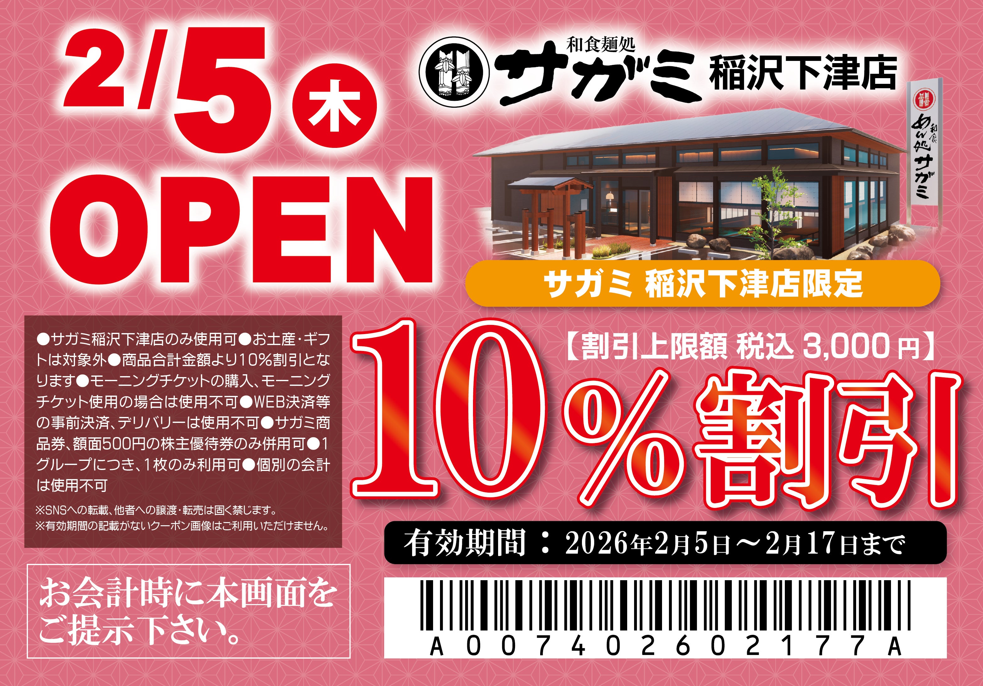 また、サガミ稲沢下津店限定でご利用いただける割引券を本リリース内に掲載しております。この画面をご提示いただくと、期間中は何度でもご利用いただけます。