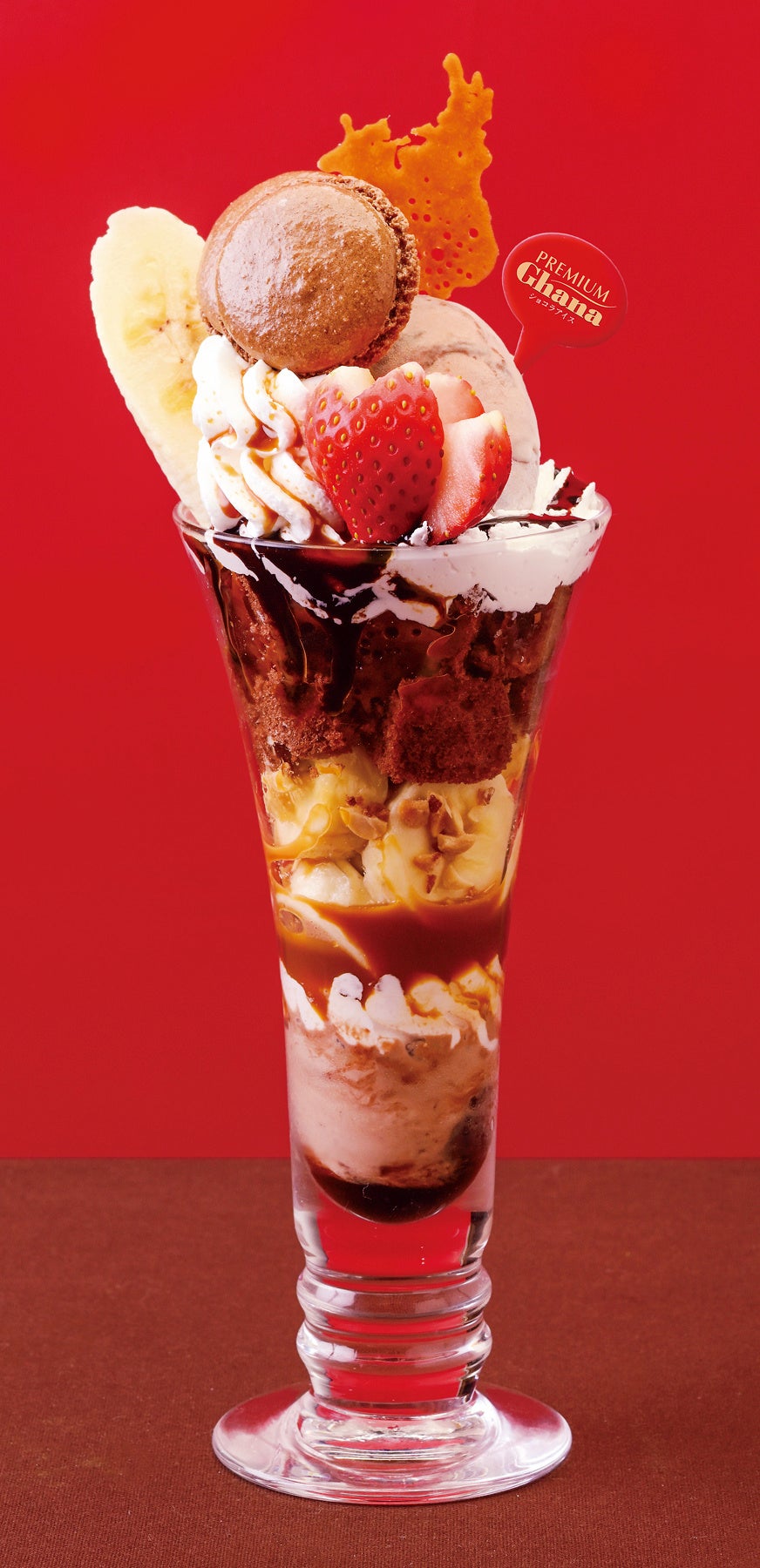 チョコレートの味わいがしっかり感じられる濃厚なショコラアイスをベースに、ホイップクリームやビターチョコソース、チョコスポンジやほろ苦いキャラメルフレーク、クラッシュナッツを重ね、仕上げにチョコレートと相性のよい苺とバナナ、マカロンをトッピング。