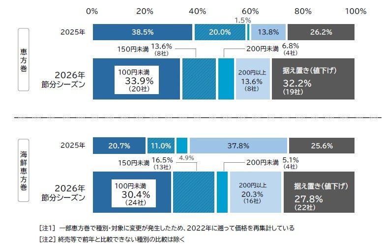 [注1]全国の大手コンビニエンスストア・外食チェーン・スーパー・日本料理店などのうち、前年の価格と比較可能な「恵方巻(五目・七目)・海鮮恵方巻」を対象とした。比較対象は合計104社。一般的な1本・18cm前後(ハーフを除く)の商品が対象(2026年時点で前年から「ハーフサイズ」のみの取り扱いとなる場合、セット商品のみの場合はそれぞれ1本あたりの金額に換算した)