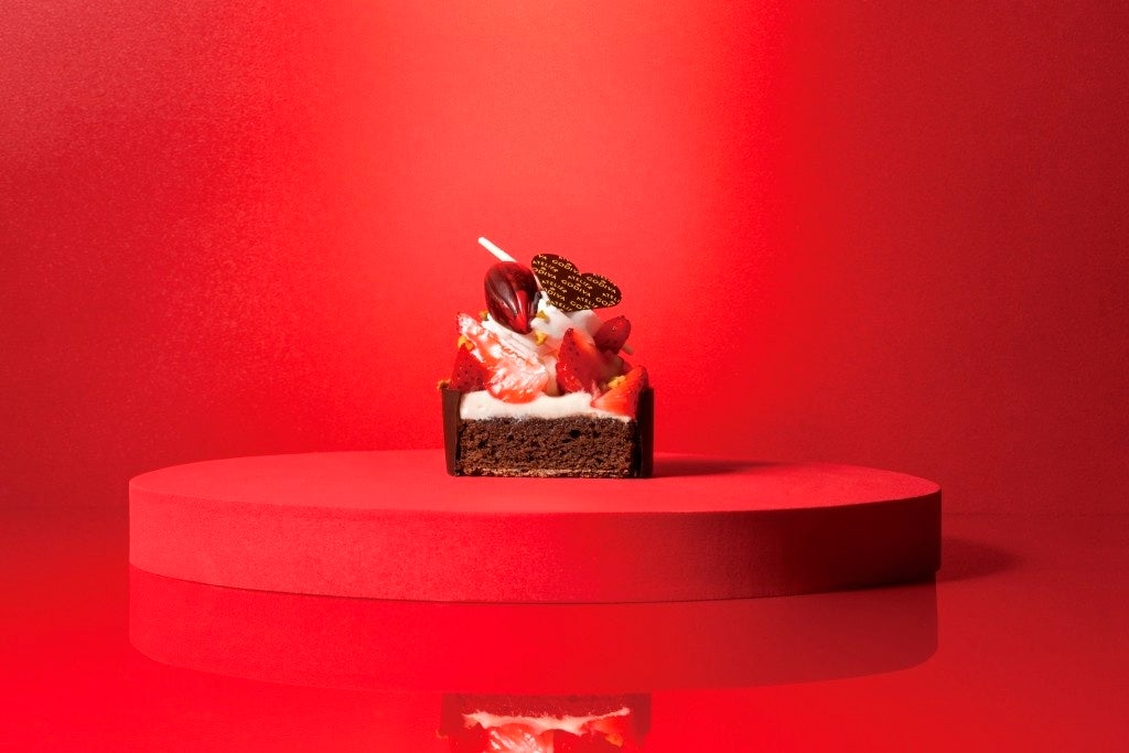 ふんわりととろける口どけが美味しいチョコレートクリームを、しっとりした食感のビスキュイパン・ド・ジェーヌに合わせて。トップにはバレンタイン気分を盛り上げる赤いハートのデコレーションを添えて。
