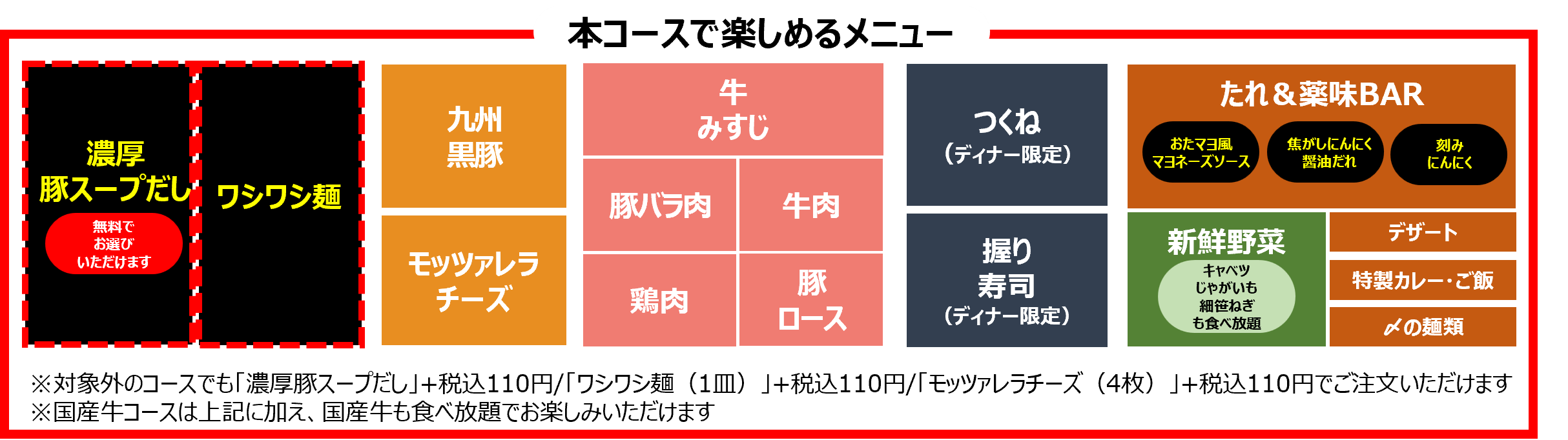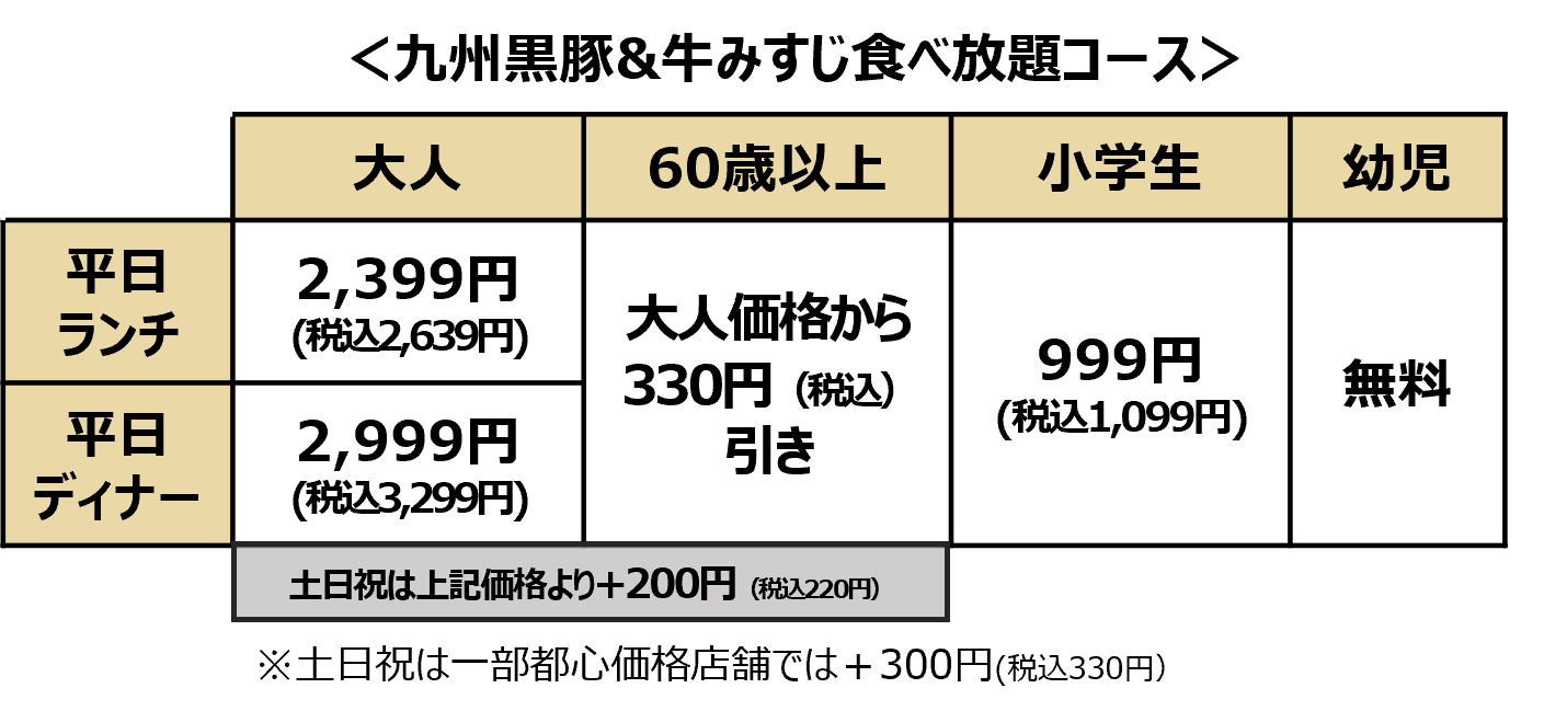 昨今の経済状況による原材料価格をはじめとした各種コストの高騰を受け、以下食べ放題コースにおける価格を、2026年1月22日(木)より、全コース(※を除く)一律+100円(税込110円)の改定をいたします。引き続き企業努力を重ね、安全・安心で楽しめる食事体験をお客さまに提供してまいります。