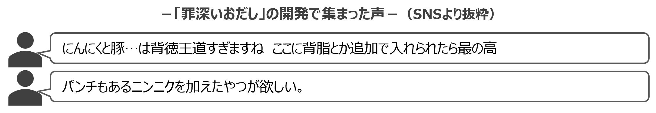 SNSで募集したアイディアの中で多くいただいた脂の旨みを存分に感じられるおだしを開発することにしました。「スープ」「かえし」と「背脂」の香りのバランスを保つことに苦戦しました。背脂はカットの大きさを何度も検証し、お客様のテーブルで最適なパフォーマンスを発揮できる切り方と量を調整しました。