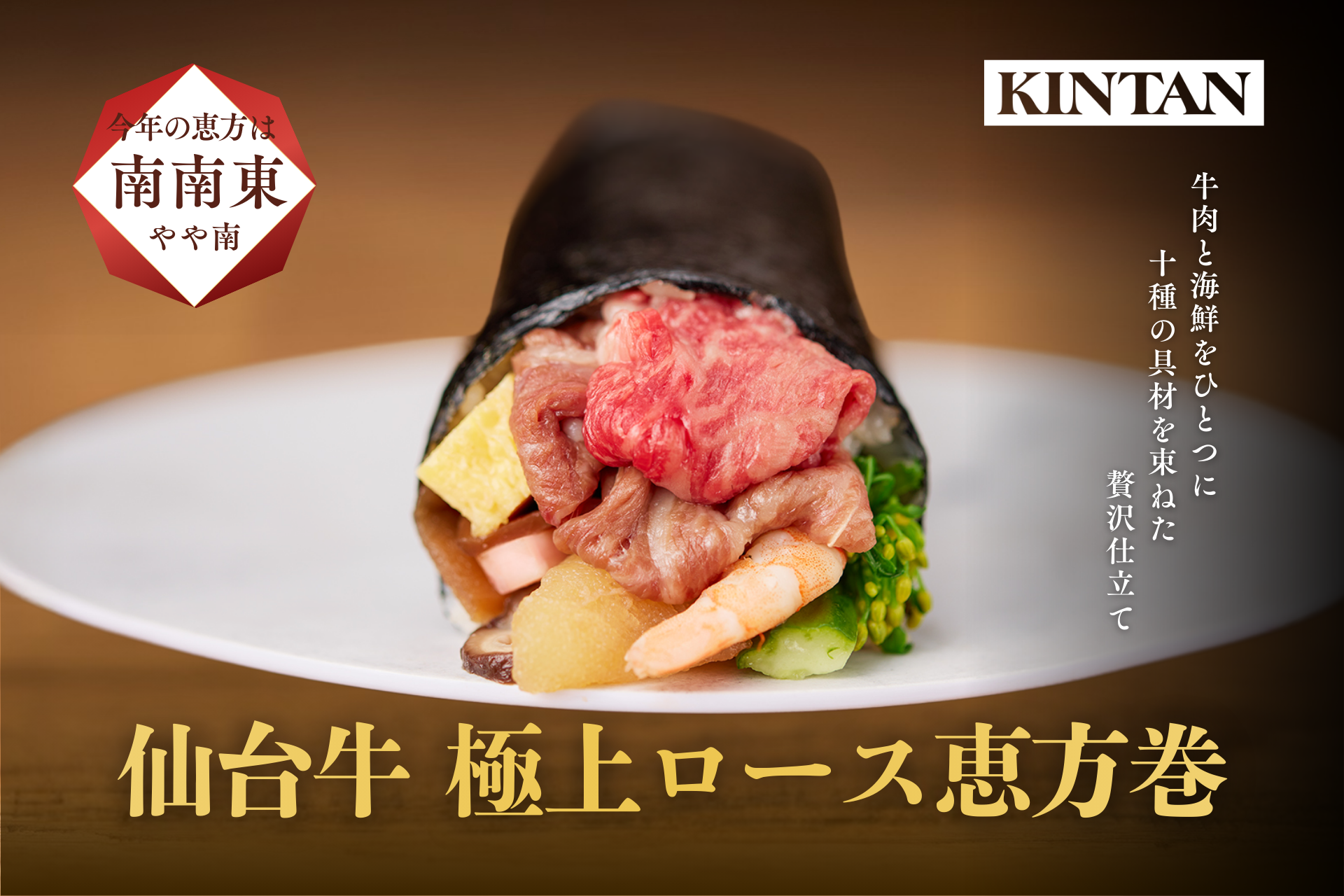 あわせて、毎年多くのお客様から支持を集める定番商品「仙台牛 極上ロース恵方巻」も展開。2026年の恵方である「南南東」を向き、願いを込めながら味わう節分のひとときを、KINTANが提案する二つの恵方巻きと共にお過ごしいただけます。