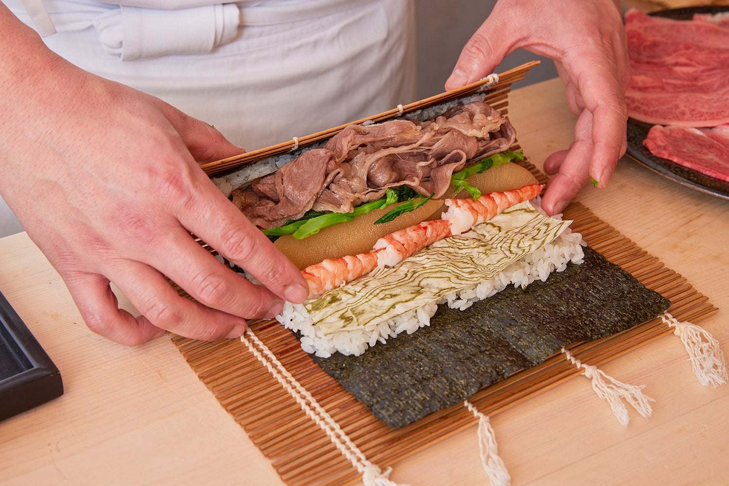 本商品では、その仙台牛の肩ロースを使用。1枚ずつさっと火を入れ、特製のすき焼きだれに絡めることで、肉の旨味を引き出しました。寿司職人と肉職人の発想を掛け合わせ、牛肉を主役に、相性の良い海鮮を厳選。かずのこの食感や北海道産・雪の磯昆布の旨味を添え、恵方巻き全体の味わいに奥行きを持たせています。