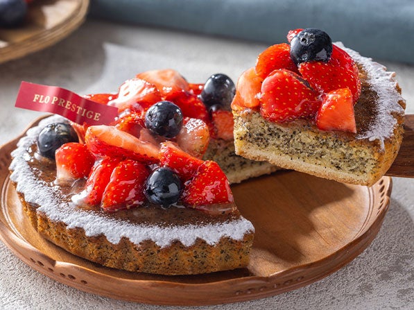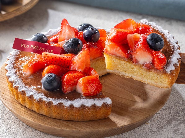 旬を迎えた苺を各店内厨房で焼き上げたタルト台にたっぷりと盛り付けブルーベリーをトッピングした、色鮮やかで可愛らしい「苺とブルーベリーのタルト」が2月FLOの日限定で登場します!