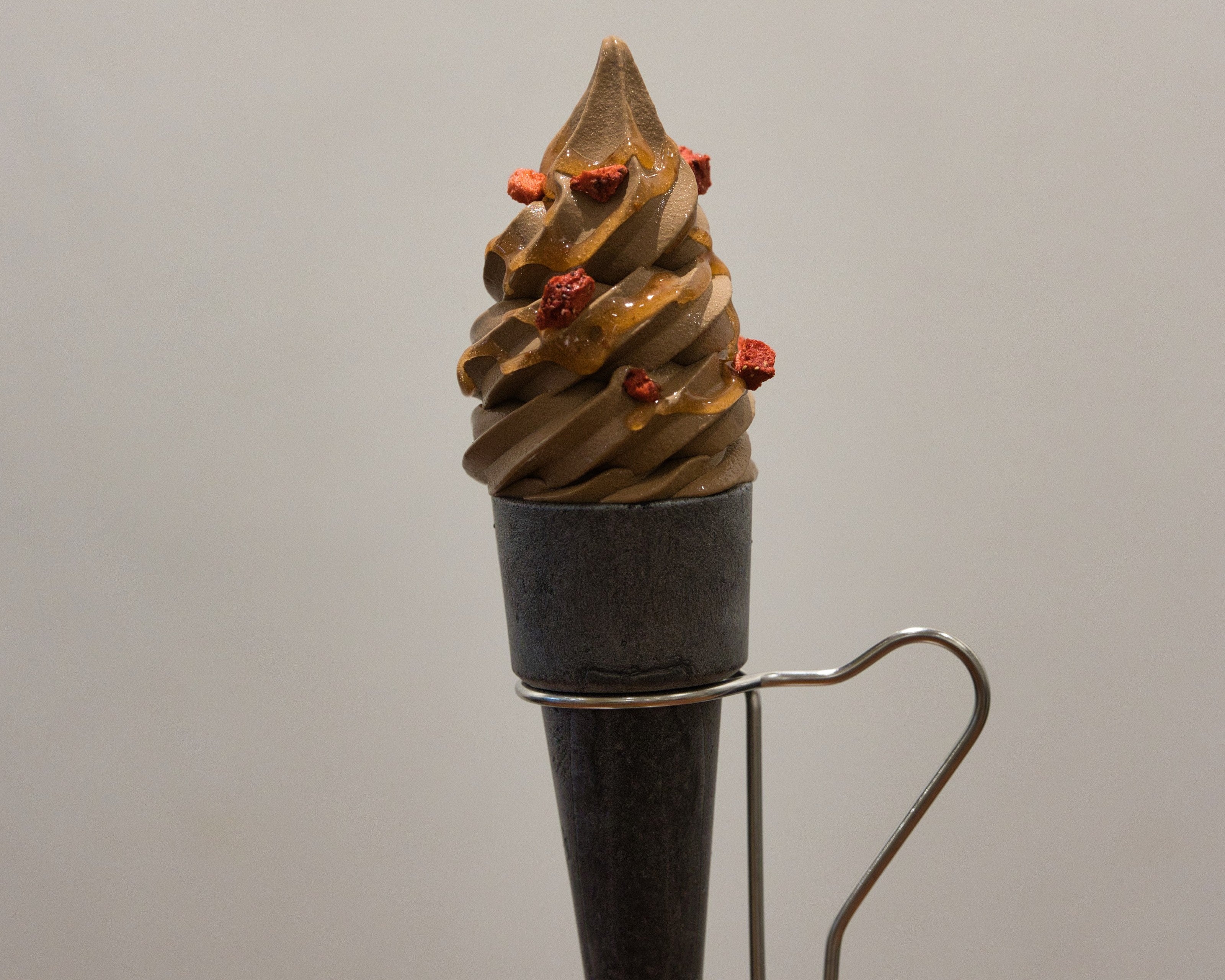 濃厚なチョコレートソフトクリームと相性抜群な、フリーズドライいちごと、能登産いちごを使った甘酸っぱいソースをトッピング。竹炭が練り込まれた最中皮コーンの底には能登大納言小豆のつぶ餡が入っているクールスイーツです。