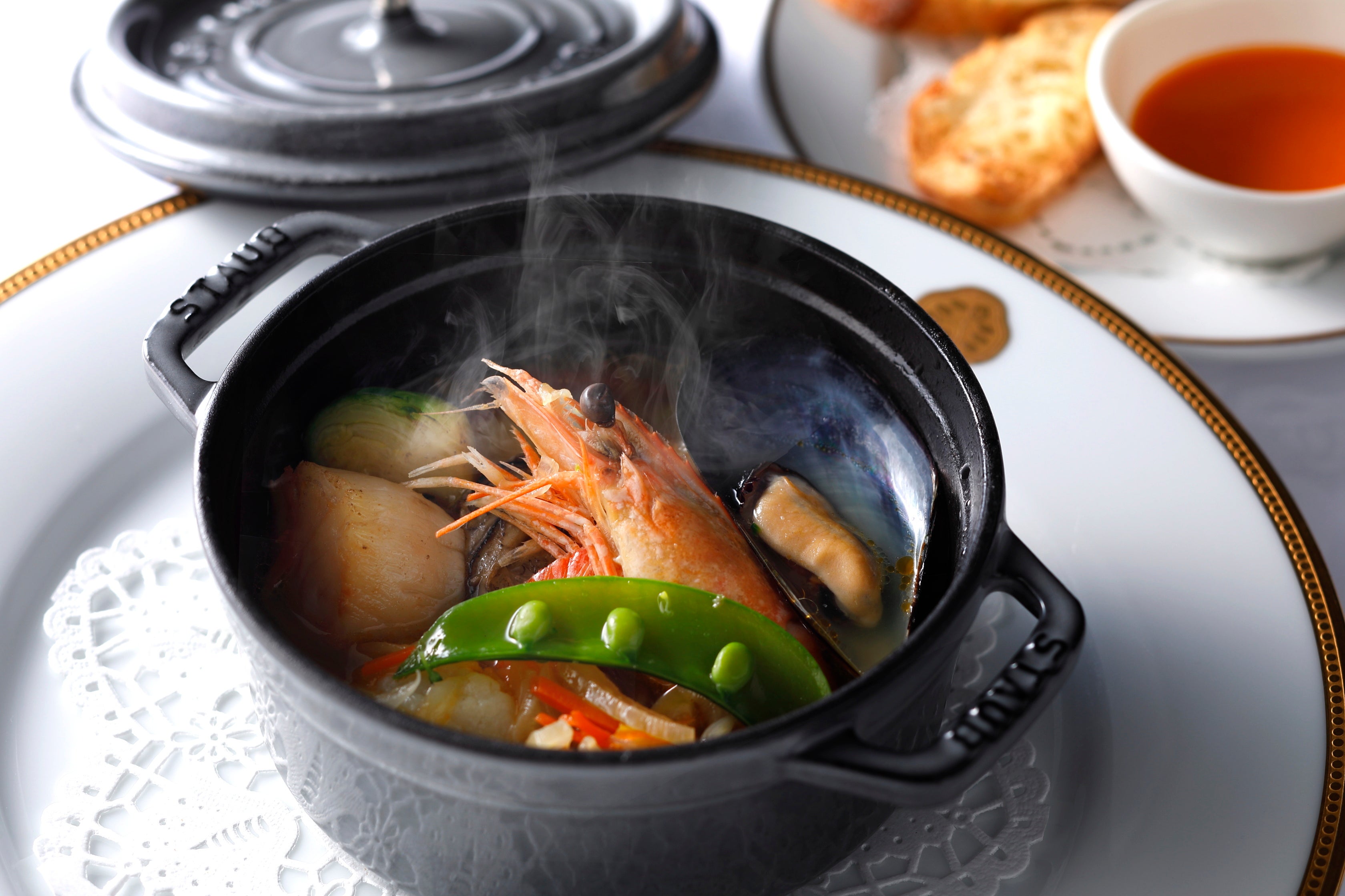 冬の味覚の鮟鱇、牡蠣の他、海の幸をふんだんに使った贅沢なブイヤベースをキャセロールでアツアツに仕上げました。濃厚で奥深い魚介の旨味をお楽しみください。