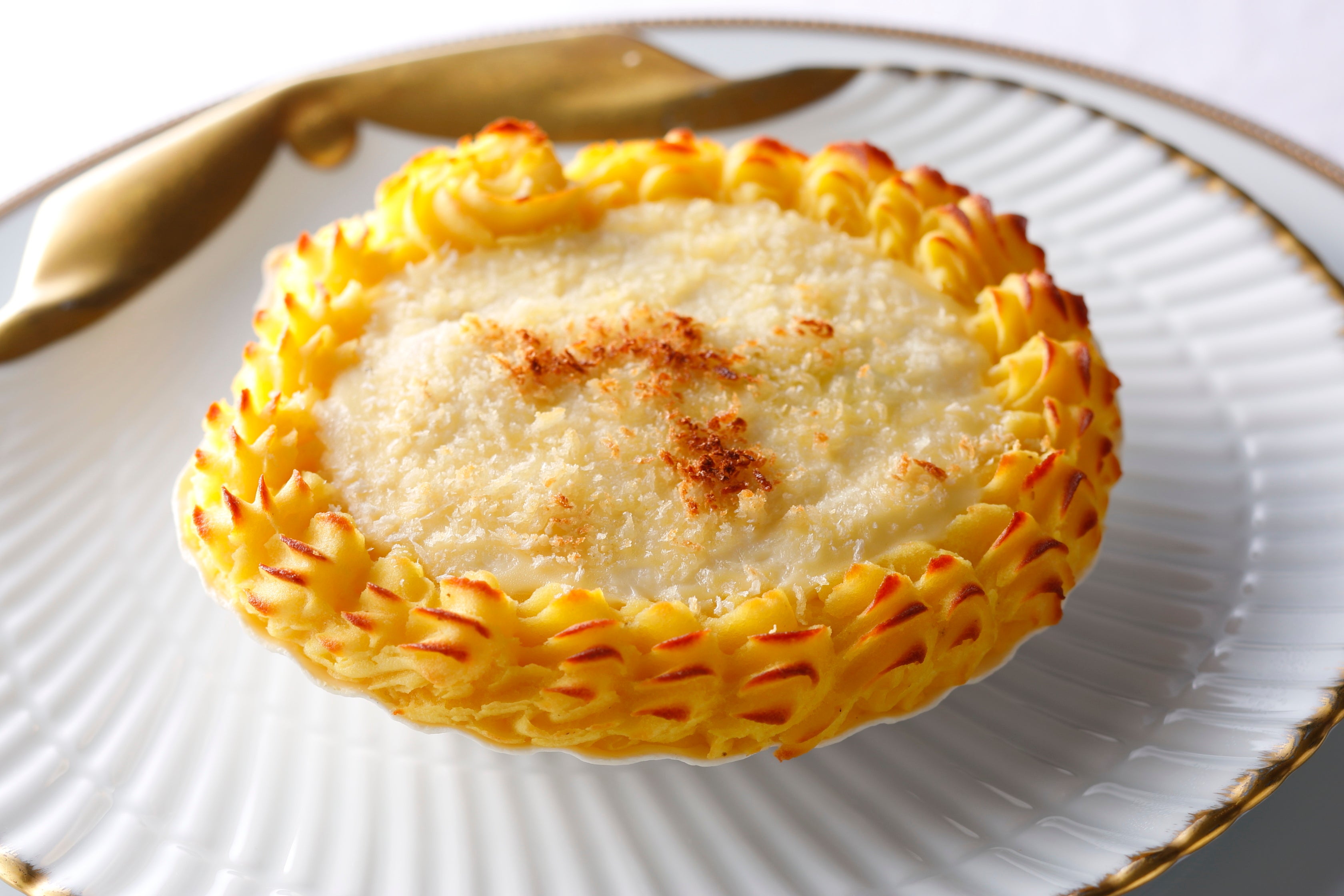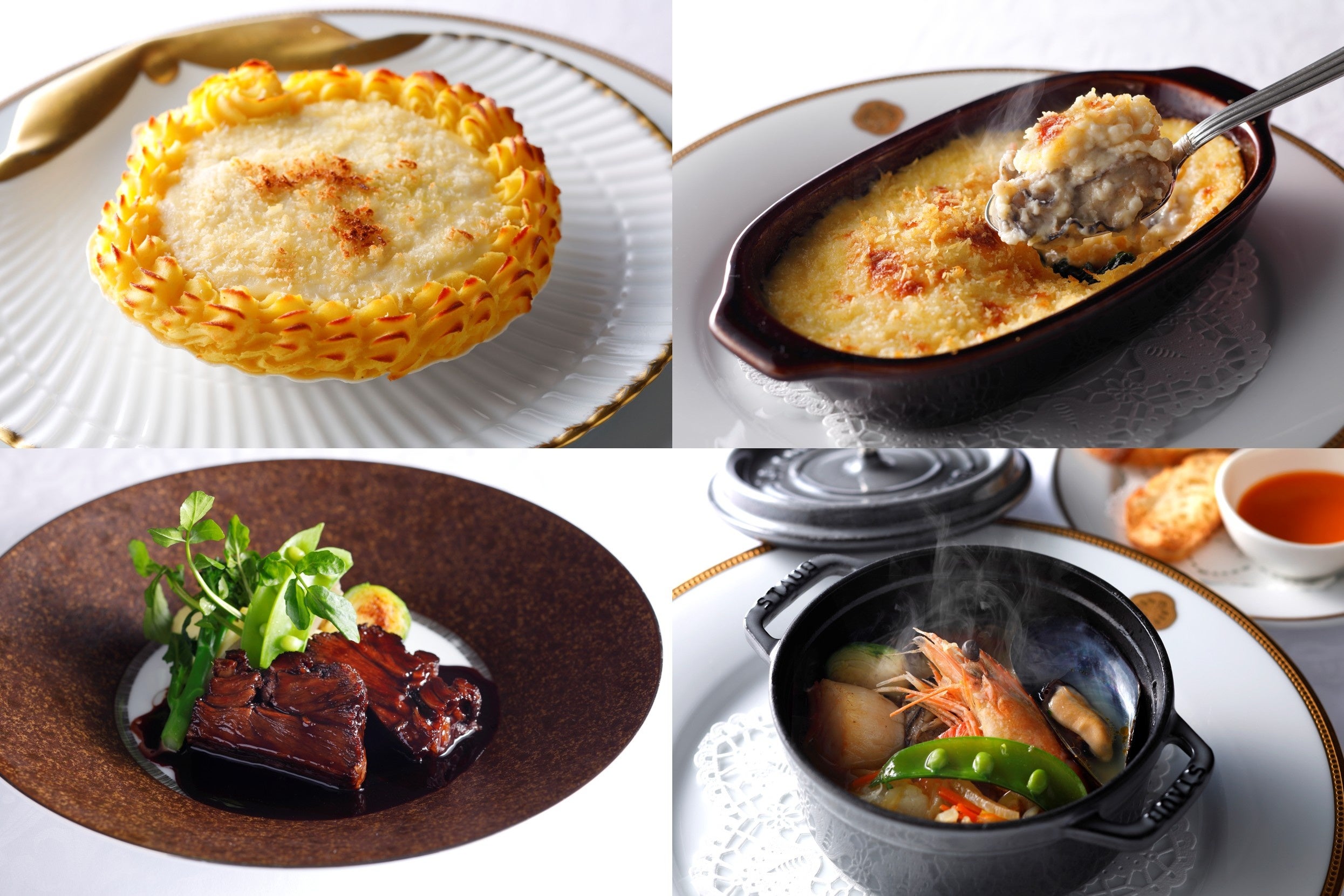帆立貝、海老、白身魚をメインにホワイトソースで仕立てたグラタンです。レースのようにあしらったマッシュポテトと一緒にお召し上がりください。
