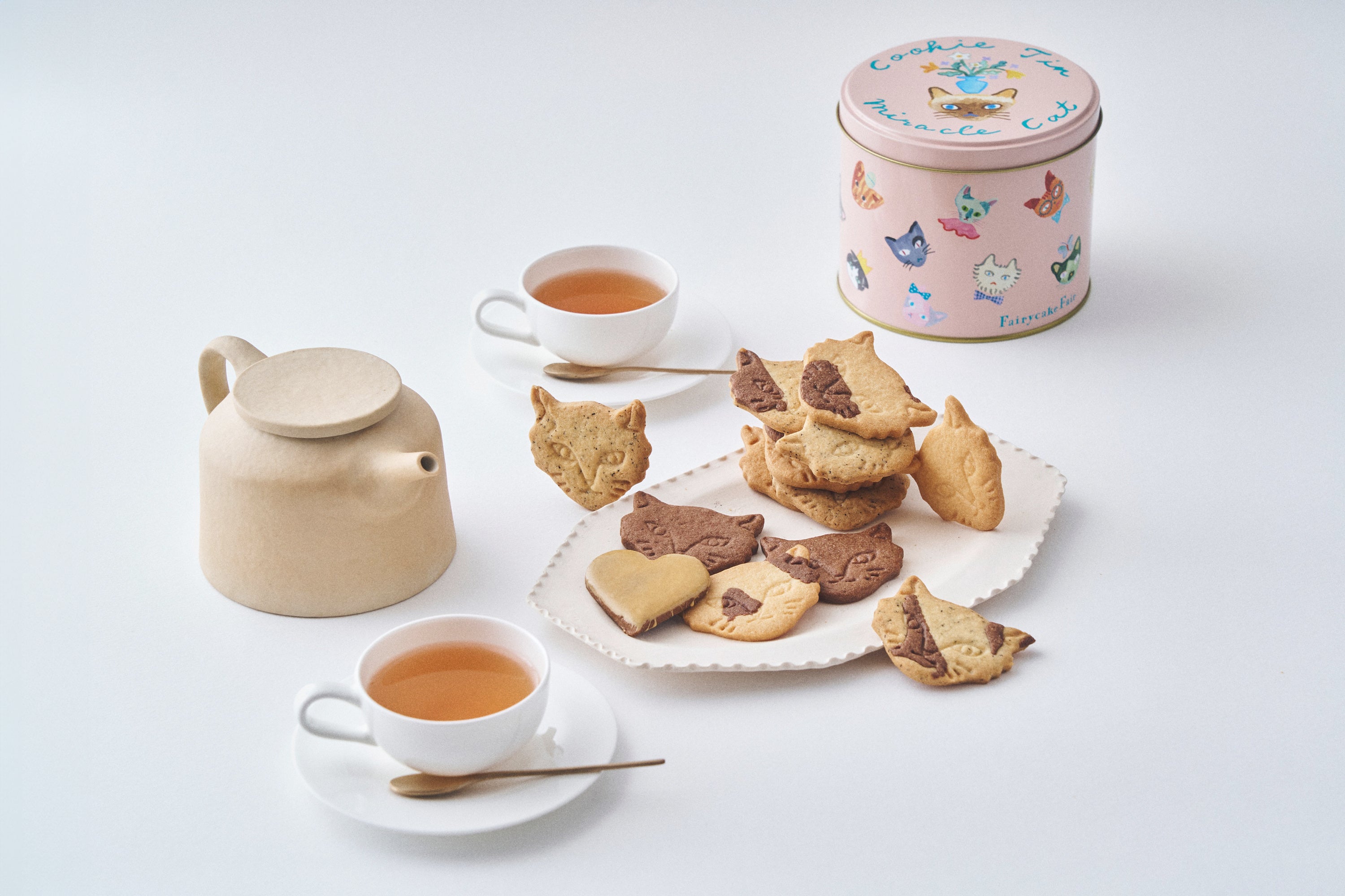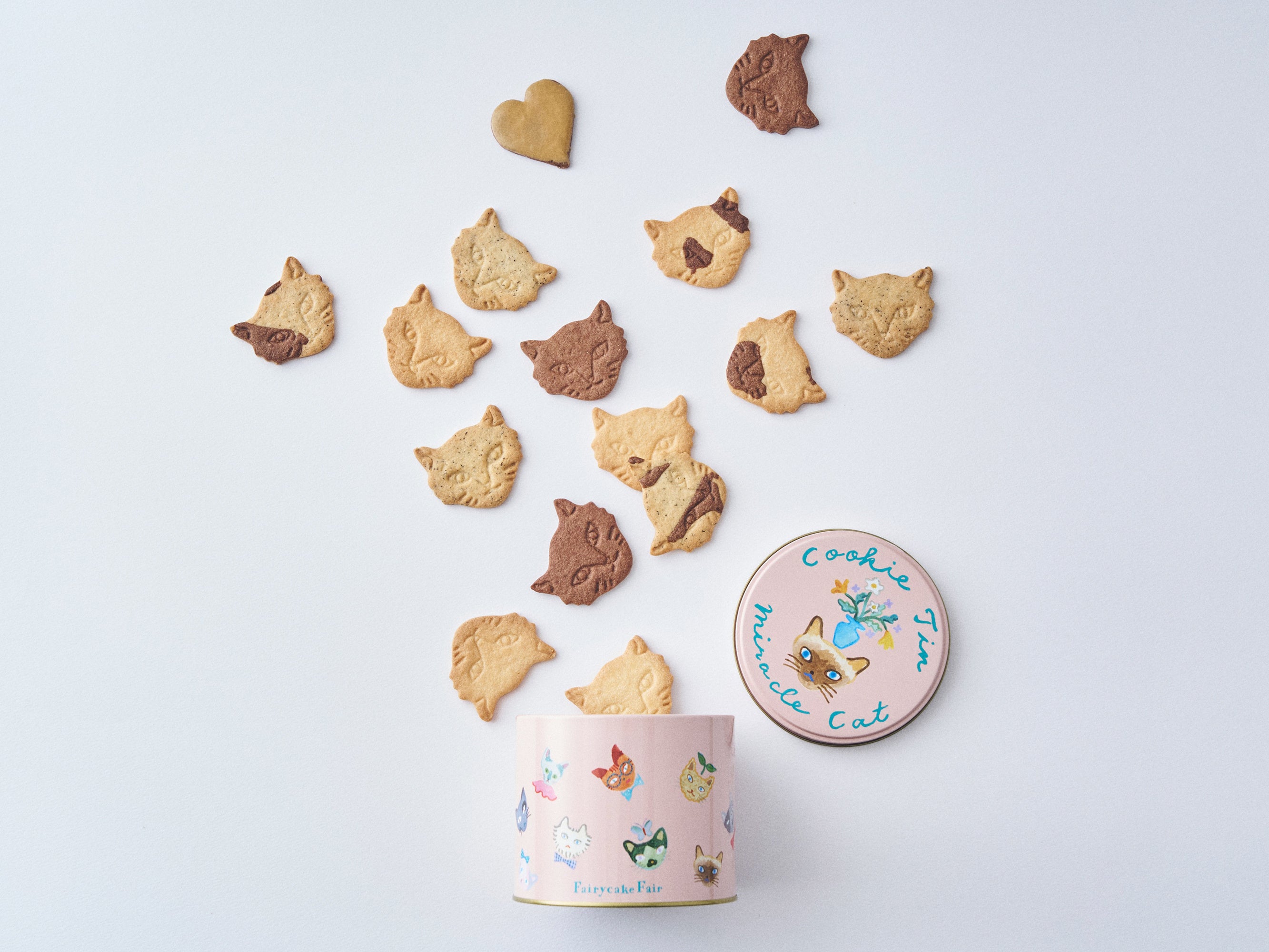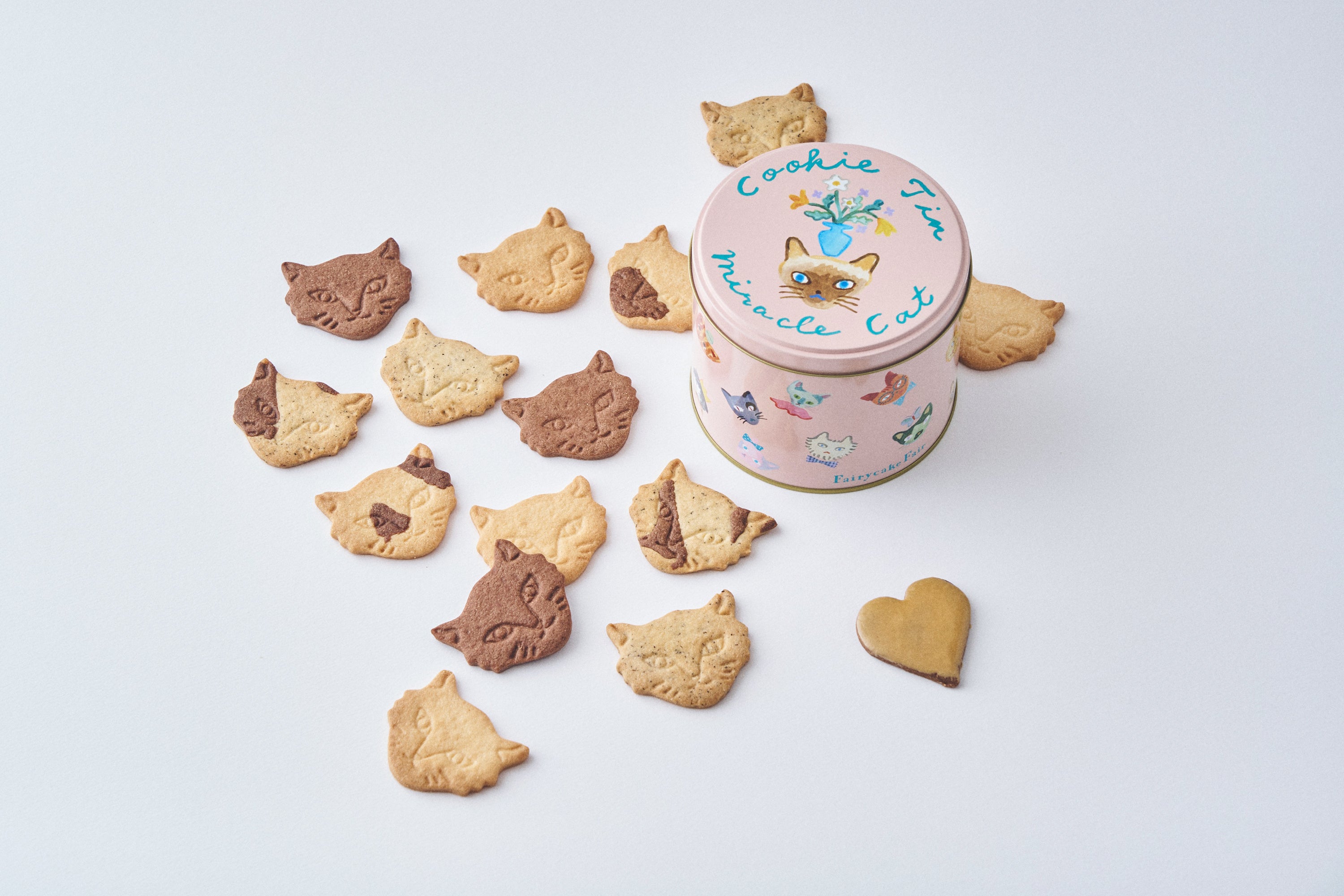 「Miracle Cat Cookie Tin(“神様のいたずら”ネコクッキー缶)」は、“神様のいたずら”のような、不思議な模様やユニークな特徴をもつミラクルキャットたちの愛おしさを伝えたくてうまれたお菓子。ミュージシャン・坂本美雨さん、イラストレーター・前田ひさえさん、フェアリーケーキフェアとの共同制作によって2021年にデビューした大人気のネコクッキー缶です。
