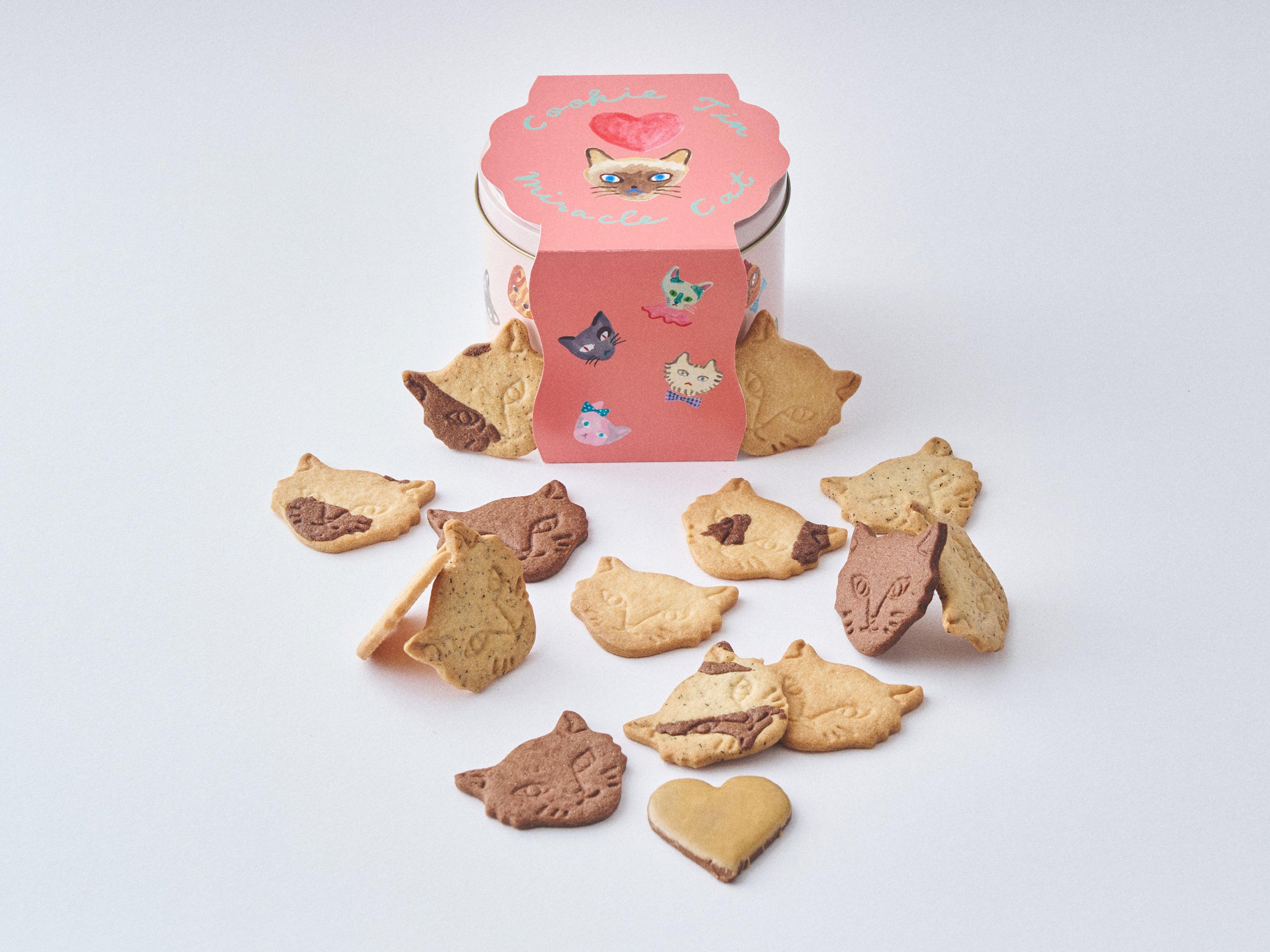 保護動物たちを支援するチャリティーアイテムとして誕生。神様のいたずらのようなめずらしい模様や特徴をもつネコたちを主役に、愛猫家の想いとお菓子がひとつになった特別なネコッキー缶。