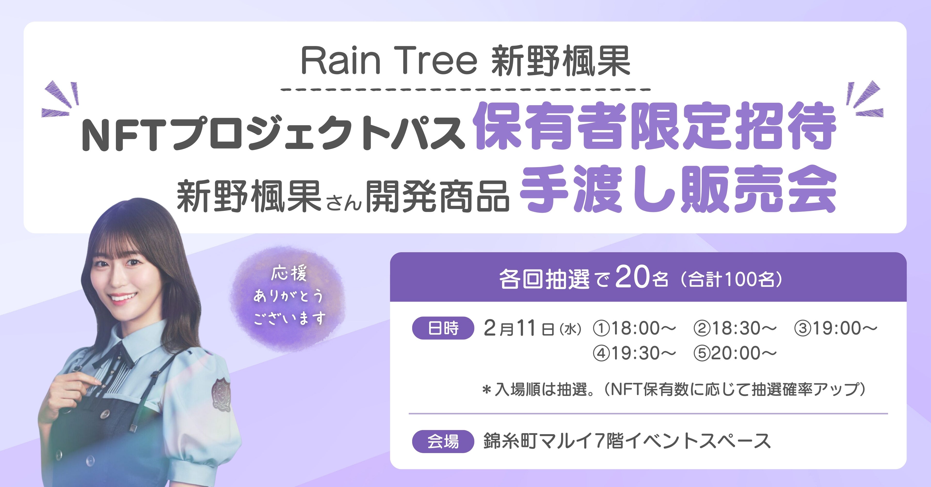 日時:2月11日(水)18:00~21:00 NFT保有者限定・Rain Tree新野風香手渡し販売会