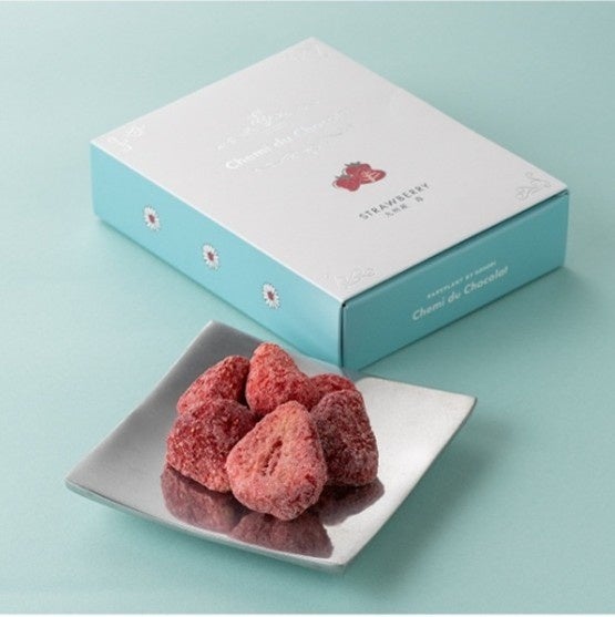 九州産の苺をまるごとフリーズドライにして、ホワイトチョコレートを浸み込ませました。見た目は苺、口に含むとチョコレートです。