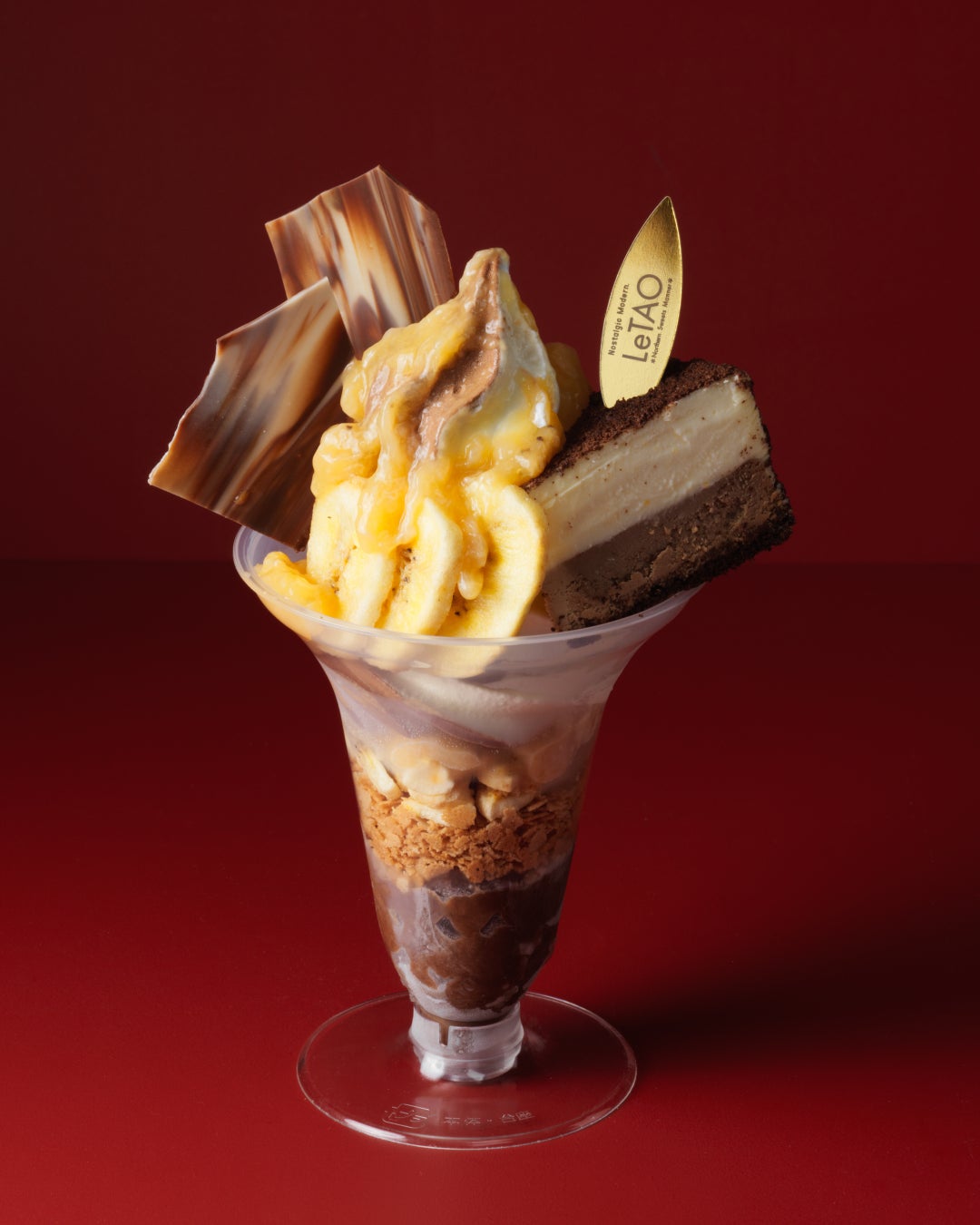 ショコラドゥーブルを飾った、カカオの奥深い香りと、濃厚なバナナをお楽しみいただけるパルフェ。なめらかなチョコプリンに、サクサクのフィアンティーヌをトッピングし、ミルクとショコラのソフト「メランジェ」に、果肉入りのバナナソースとカリッと軽やかなバナナチップを合わせ、お子さまから大人まで楽しめる味わいに仕立てました。