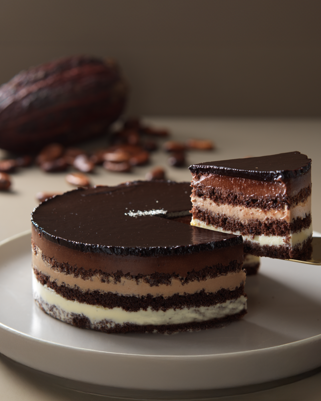 3種類のカカオをそれぞれの特性に合わせて作った、三層仕立てのムースケーキ。下層には芳醇な風味のバニラと、ガーナ産カカオを使ったミルクリッチなホワイトチョコのムースショコラブラン、中層のショコラオレムースには、エクアドル産カカオ豆を使ったチョコレートを、3層目にはカカオ分70%のハイカカオクーベルチュールを使用したクレームショコラノワールを重ねました。
