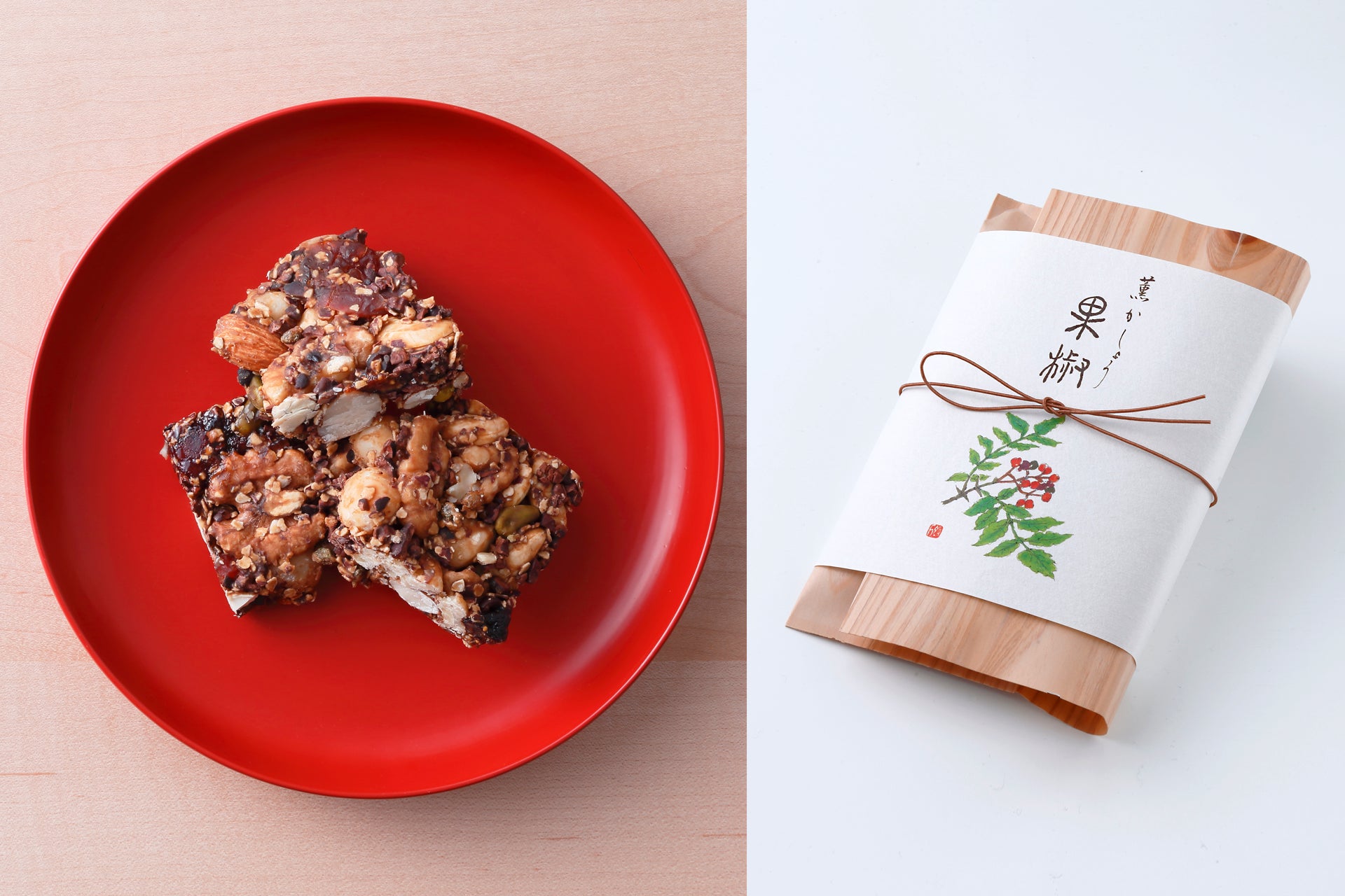 数種の木の実やドライフルーツ、小豆を寄せ固め、ぴりりと爽やかな実山椒を忍ばせた和久傳の定番菓子「果椒」。この果椒にカカオニブを加えた、この季節だけの味わいをご用意しました。木の実の香ばしさ、果実の自然な甘み、山椒の清涼感に、カカオのほろ苦さと香りが重なり、ひと口ごとに奥行きが広がります。