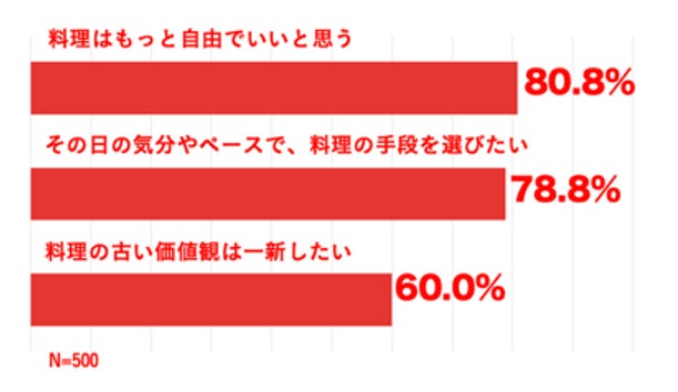 一方で、意識はすでに変わり始めています。「料理はもっと自由でいいと思う:80.8%」「その日の気分やペースで、料理の手段を選びたい:78.8%」「料理の古い価値観は一新したい:60.0%」など、「料理のねばべき」に縛られたままではいたくない、そんな声が、数字からも読み取れます。