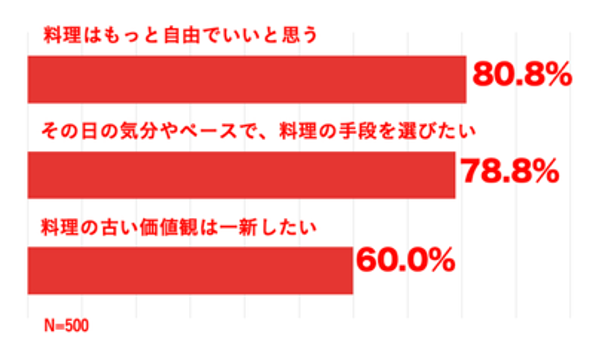 一方で、意識はすでに変わり始めています。「料理はもっと自由でいいと思う:80.8%」「その日の気分やペースで、料理の手段を選びたい:78.8%」「料理の古い価値観は一新したい:60.0%」など、「料理のねばべき」に縛られたままではいたくない、そんな声が、数字からも読み取れます。