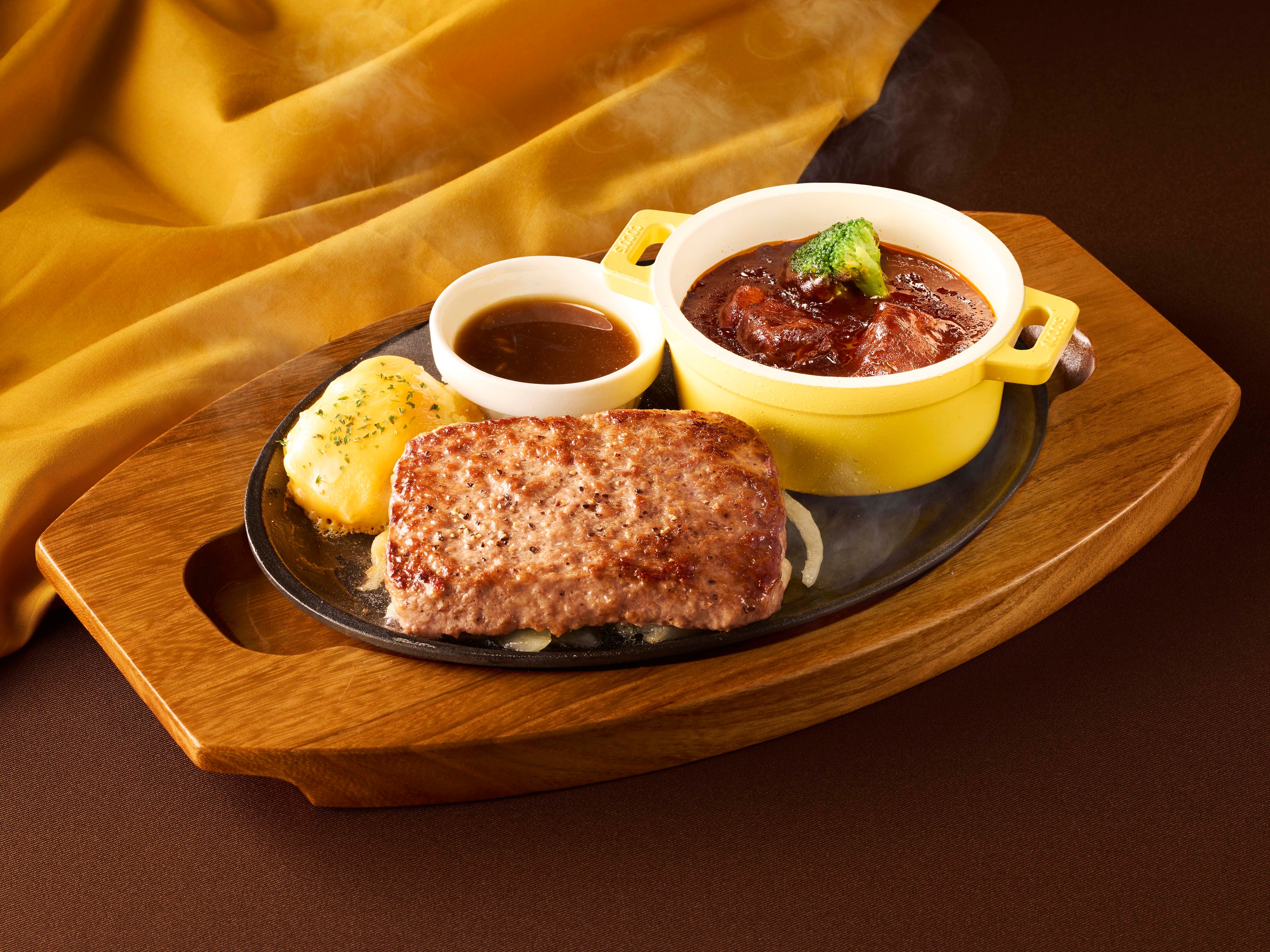 「ビーフハンバーグステーキ&ココスの濃厚ビーフシチュー」は、ココスで人気の「ビーフハンバーグステーキ」とマデラ酒が香る濃厚ビーフシチューを一緒にお召し上がりいただける欲張りなメニューです。付け合わせにはコクのあるチェダーチーズをトッピングしたマッシュポテトを添えました。