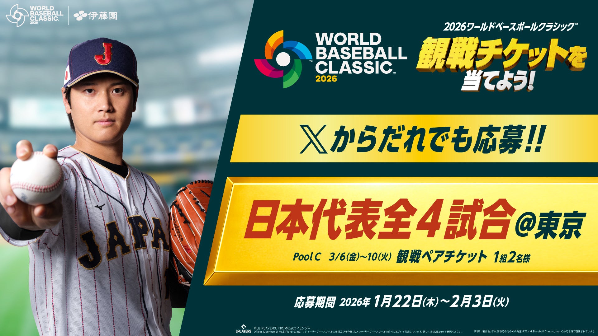 株式会社伊藤園(代表取締役社長:本庄大介 本社:東京都渋谷区)は、2026年3月に開催される「2026 World Baseball Classic」のグローバルパートナーとなり、日本代表戦全4試合を観戦できるプレミアムなペアチケットが1組2名に当たるキャンペーンを2026年1⽉22⽇(木)より、さらに1次ラウンド(東京)および最終ラウンド(マイアミ)観戦ペアチケットが120組240名に当たるキャンペーンを2⽉9⽇(月)より開始します。また同日より、大谷選手の過去大会の活躍シーンやファンへ期待を呼びかける新作CMも順次公開します。