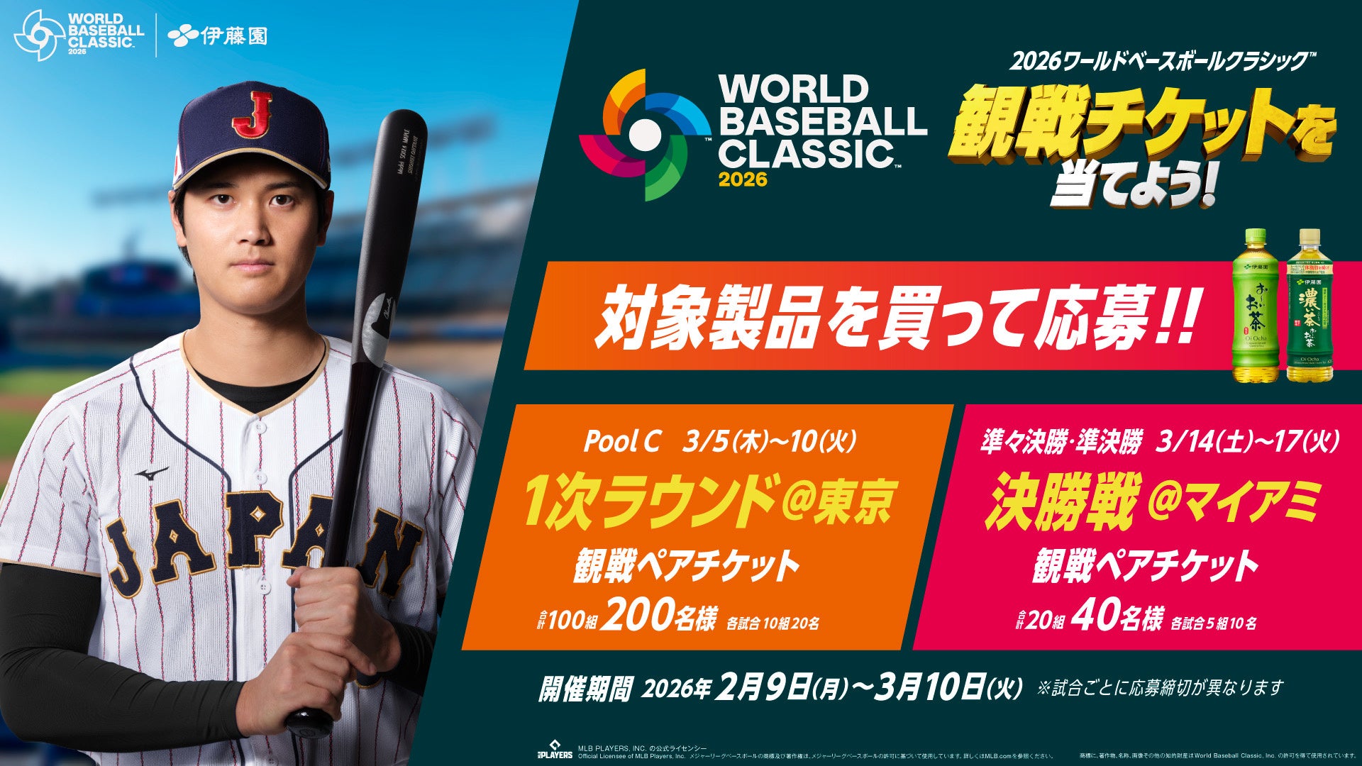 株式会社伊藤園(代表取締役社長:本庄大介 本社:東京都渋谷区)は、2026年3月に開催される「2026 World Baseball Classic」のグローバルパートナーとなり、日本代表戦全4試合を観戦できるプレミアムなペアチケットが1組2名に当たるキャンペーンを2026年1⽉22⽇(木)より、さらに1次ラウンド(東京)および最終ラウンド(マイアミ)観戦ペアチケットが120組240名に当たるキャンペーンを2⽉9⽇(月)より開始します。また同日より、大谷選手の過去大会の活躍シーンやファンへ期待を呼びかける新作CMも順次公開します。
