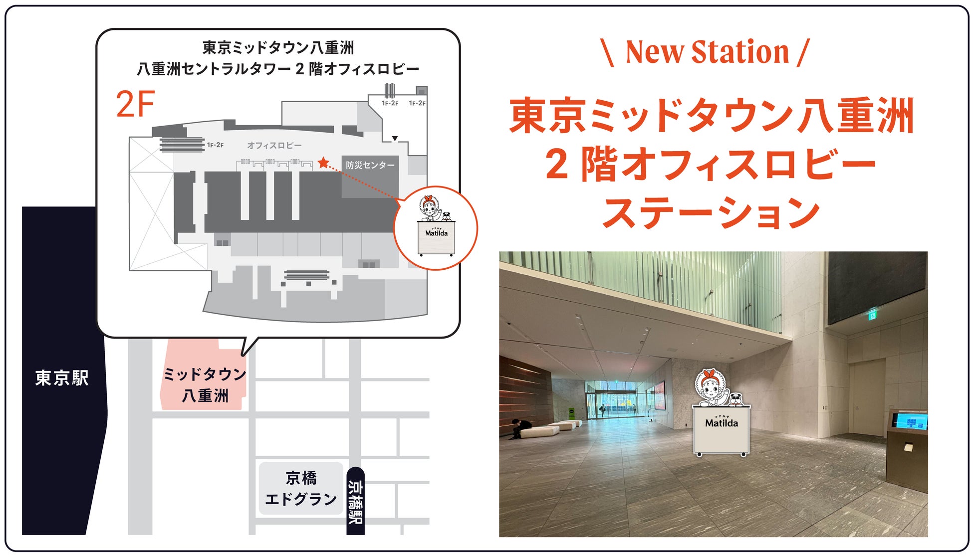 東京駅直結という利便性の高い立地に位置する東京ミッドタウン八重洲は、多くのワーカーが行き交う一方で、認定こども園や小学校をはじめとした子育て世帯向けの施設も併設されており、働く人と暮らす人が交差する場所です。また、これまで八重洲エリアでは、マチルダのステーション開設を望む声を多くいただいていました。