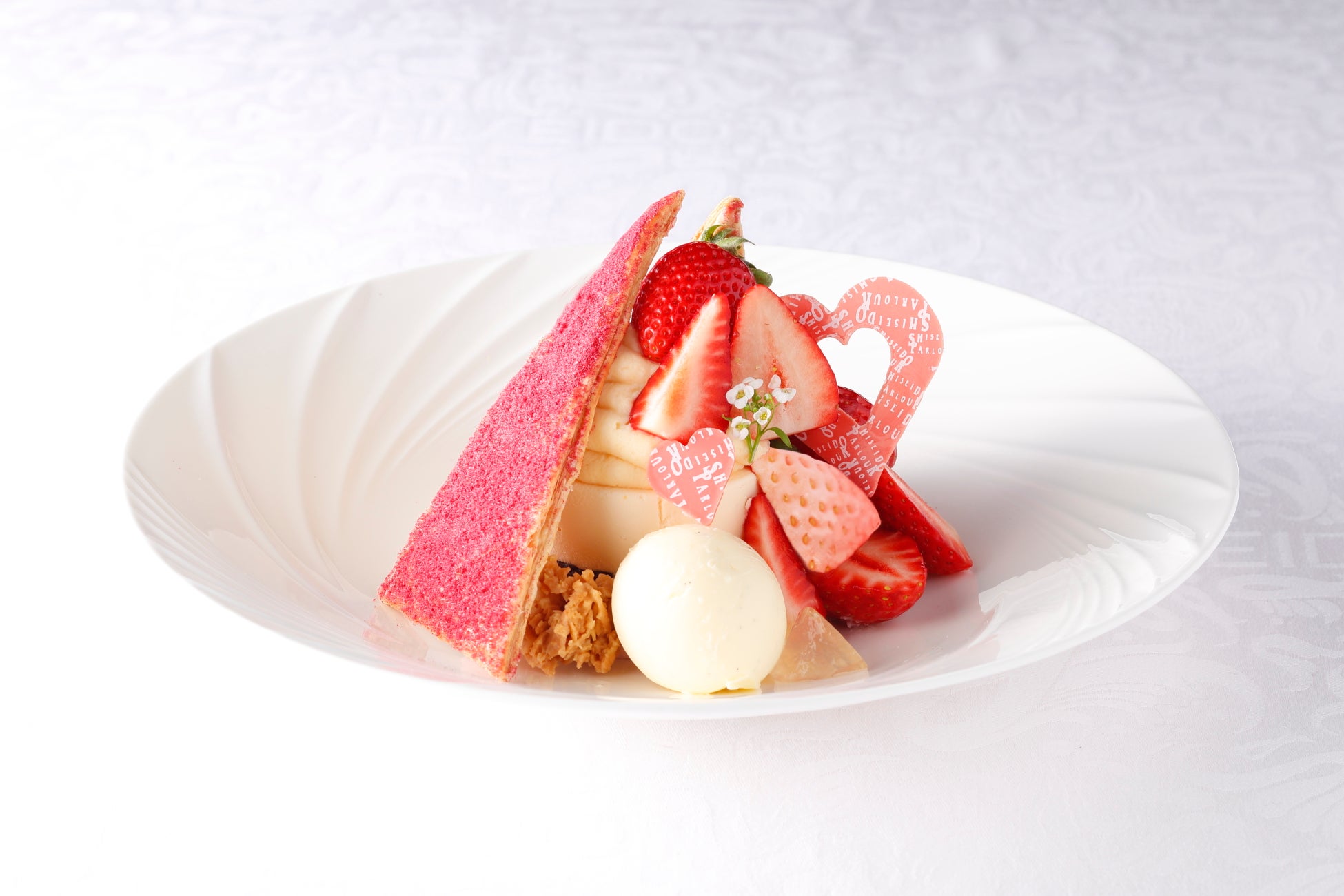 「二種の苺を使用したミルフィーユ 伝統のバニラアイスクリーム添え」