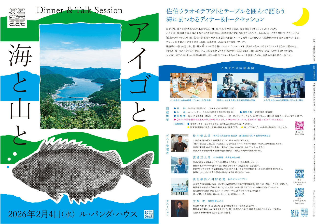 一般社団法人KIISAは、2026年2月4日(水)にディナー&トークセッション「アイゴと海と山と」をル・パンダ・ハウス(大分県佐伯市)にて開催いたします。磯焼けの一因とされる植食性魚類・アイゴをテーマに、食と海のスペシャリストとのトークセッション、シェフによるアイゴを用いた料理とともに、佐伯の海の今とこれからを語らう一夜です。このイベントは、次世代へ豊かで美しい海を引き継ぐために、海を介して人と人とがつながる“日本財団「海と日本プロジェクト」”の一環です。