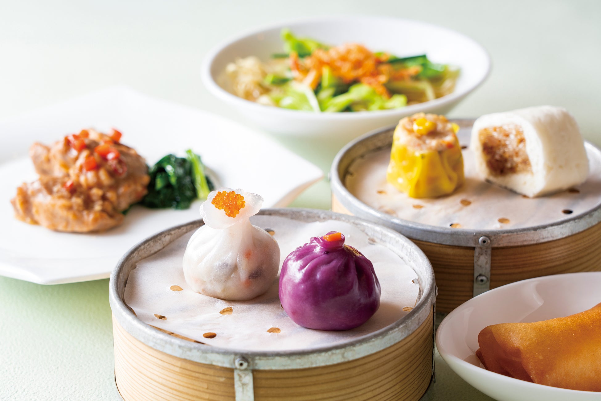 ・特製点心5種(潮州風もち米ロール、海老とガーリック入り春巻き、とうもろこし入り海老焼売、巾着型鶏肉の蒸し餃子、野菜入り蒸し餃子)