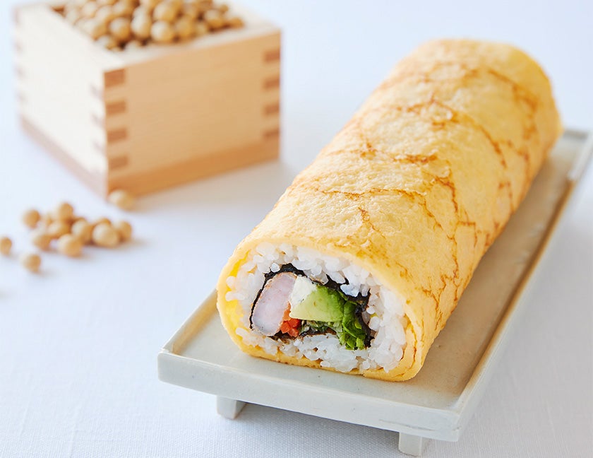 海老・アボカド・クリームチーズを、甘みのあるふんわりした薄焼き玉子で包みました。千切りにした生野菜と人参のナムルも入った“サラダ恵方巻き”。