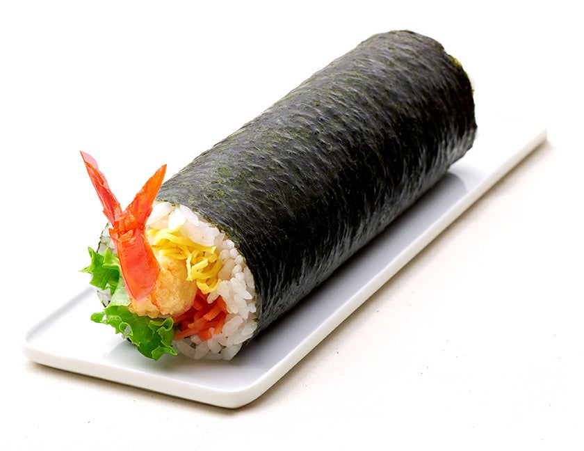 大人気商品「大海老マヨ」を丸ごと2尾巻いた、贅沢な恵方巻。プリッとしたえびと特製「マヨソース」が絶妙に絡む、お子様から大人まで楽しめるおいしさ!