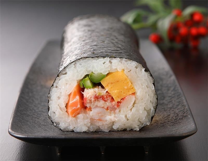 京都丹後・与謝野町産のお米を酢飯にし、紅ずわいがにやサーモントラウト、えびといった海鮮をたっぷり。自慢の具材を、歯切れと香りのよい国産海苔で巻いて。