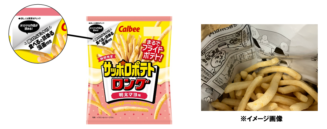 また今回は、捨てられるだけになりがちな包材に新たな価値を付与する新企画として、パッケージを開けるとフィルム内側に“ランダムな漫画”が現れる仕様を採用。8名のクリエイターによる描き下ろし漫画を全8種掲載し、食べるだけでなく読んでも楽しい、新感覚のパッケージに仕上げています。子どもから大人まで楽しんでいただける『サッポロポテトロング 明太マヨ味』を、ぜひお召し上がりください。