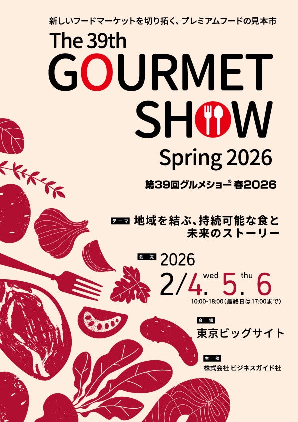 株式会社ビジネスガイド社は2月4日から6日、新しいフードマーケットを切り拓く、プレミアムフードの見本市「第39回グルメショー春2026」を東京ビッグサイト東4ホールで開催します。こだわりや想い、ストーリーが詰まった高品質なフードギフトが一堂に会します。当見本市ならではの企画、キッチンステージプログラムも満載です。