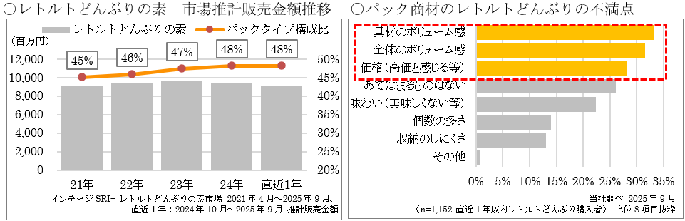 複数個がセットになったパック商材は1個あたりの手軽な価格から買い置きが定着し、レトルトどんぶりの素市場における構成比が拡大しています。一方でその具材量・内容量には不満が存在し、価格とのバランスが求められています。