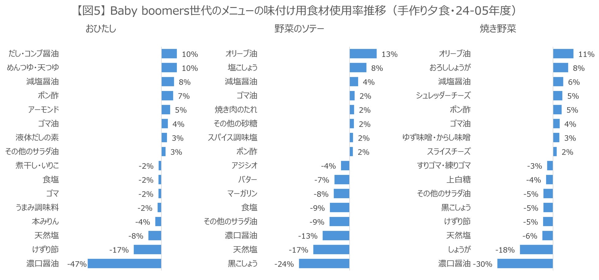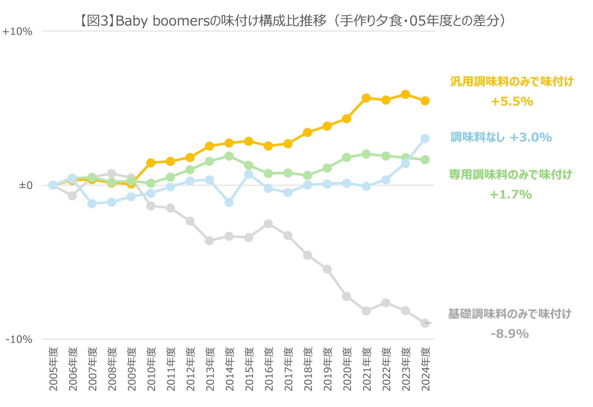 【図3】は、Baby boomers世代の手作りした夕食メニューの味付け方法構成比を2005年度との差分で表したものです。