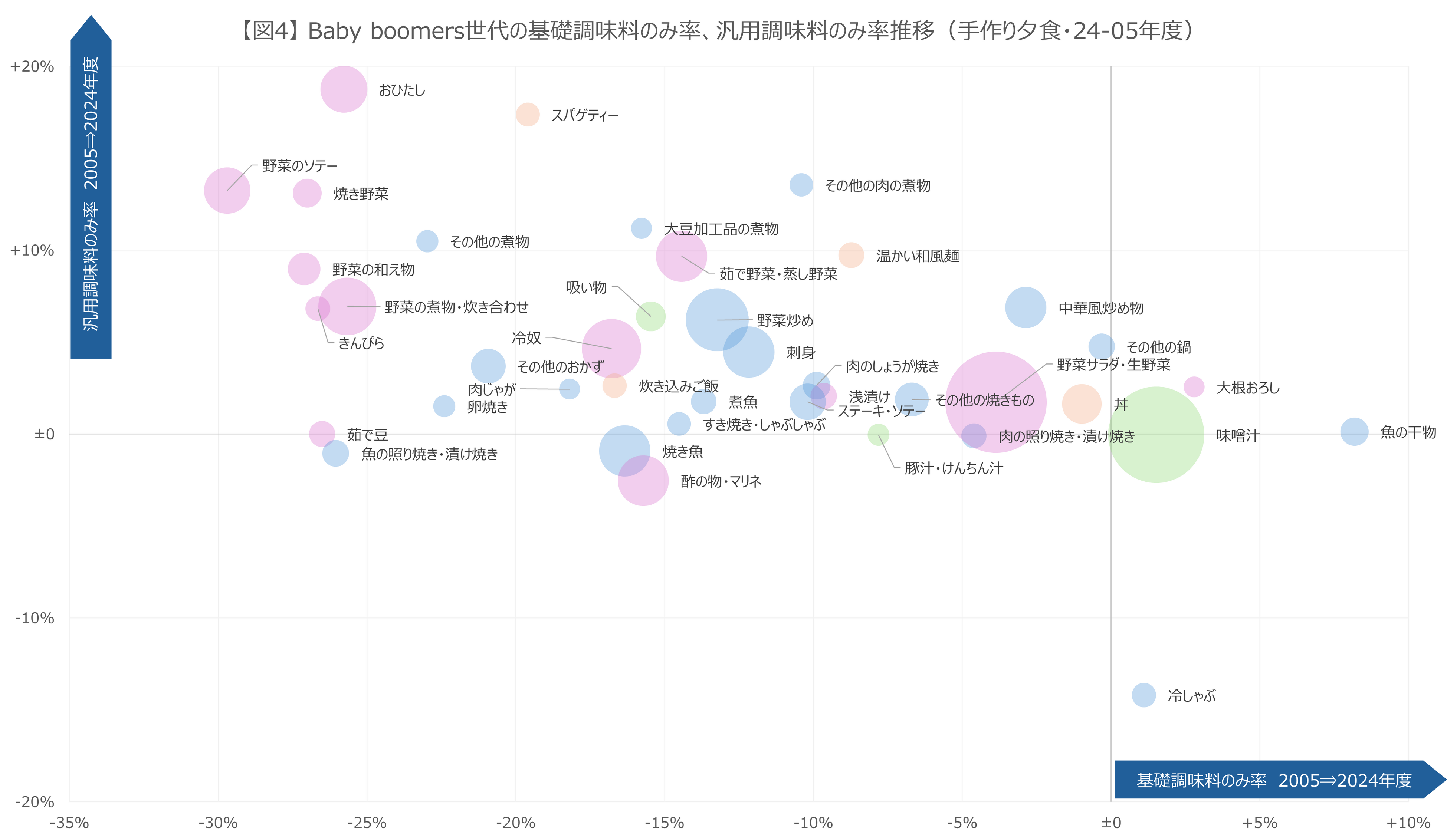 【図4】は、20年前と直近の夕食での「基礎調味料のみで味付け」と「汎用調味料のみで味付け」の構成比の差分を表しています。左上の象限にあるメニューが、「基礎調味料のみでの味付けが減少し、汎用調味料のみでの味付けが増加したメニュー」ということになります。