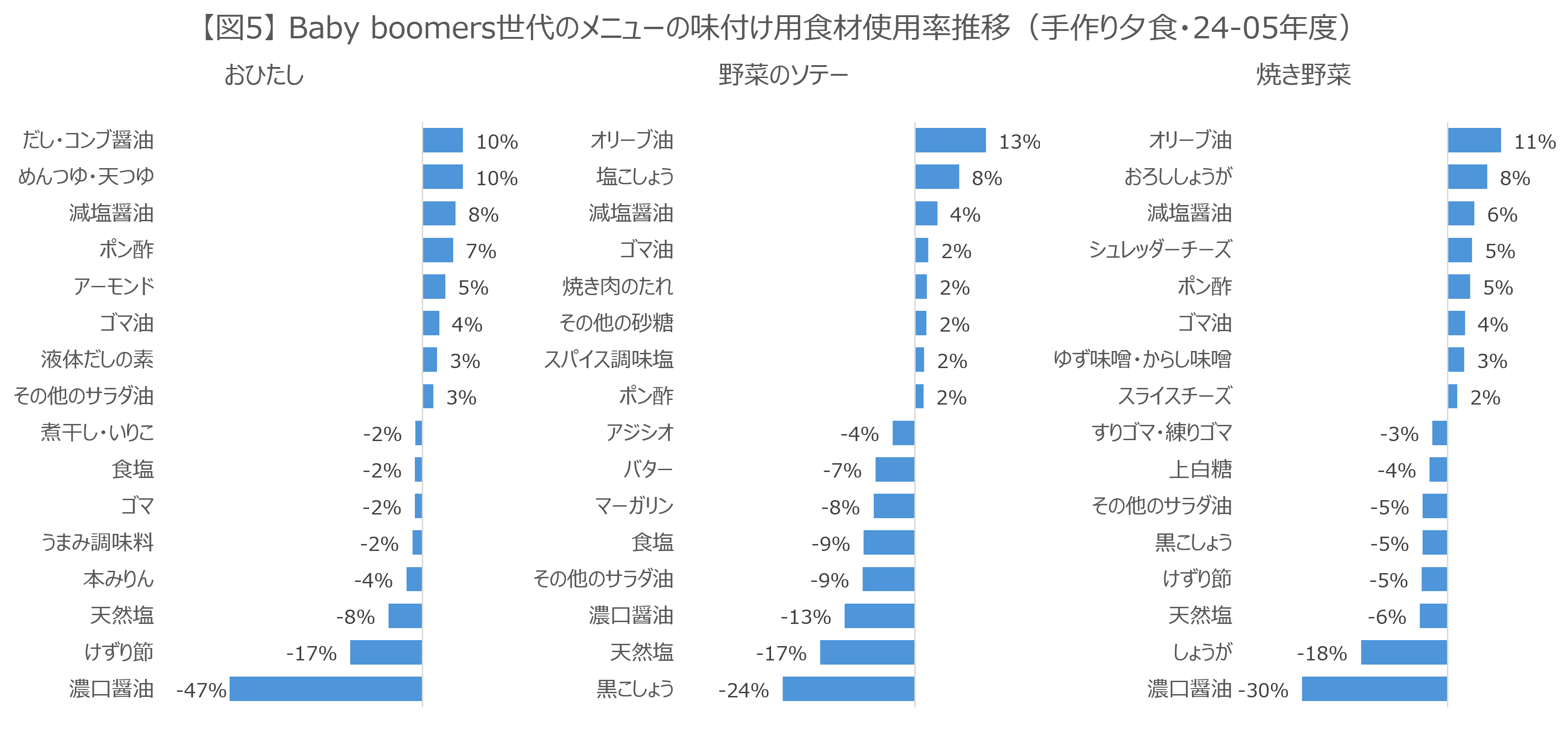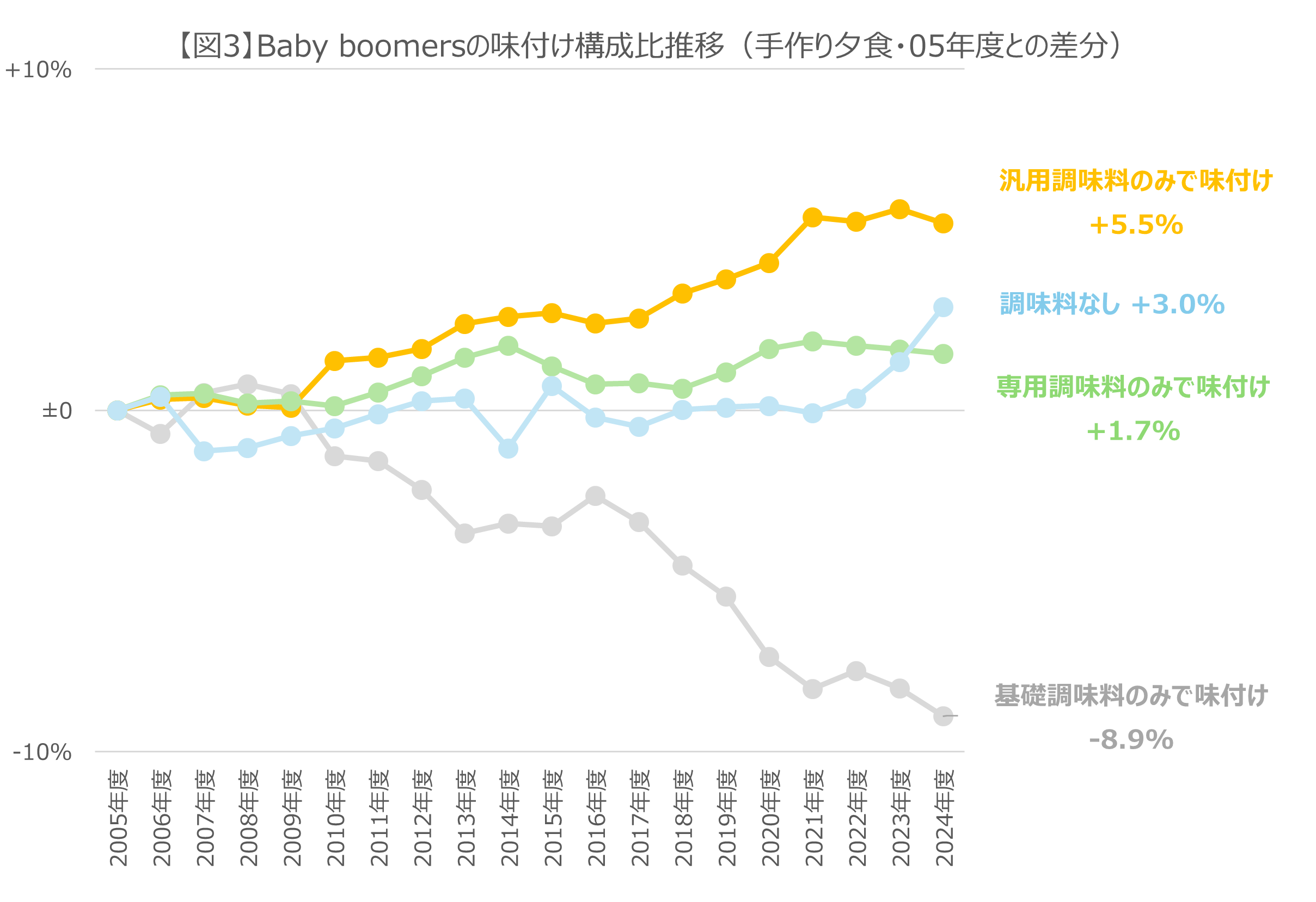 【図3】は、Baby boomers世代の手作りした夕食メニューの味付け方法構成比を2005年度との差分で表したものです。
