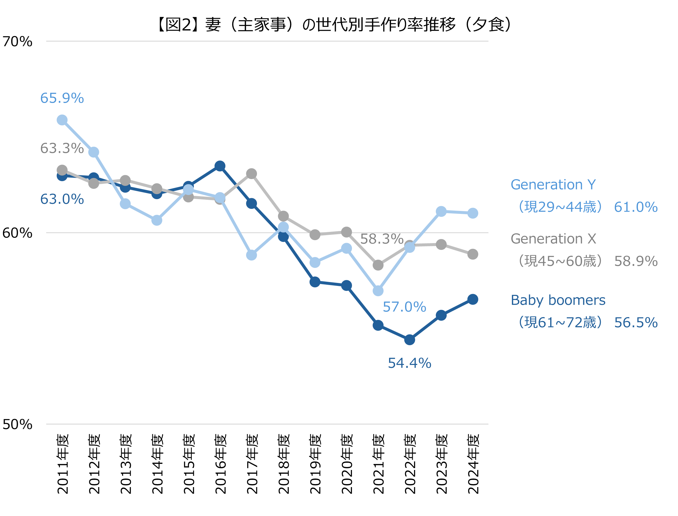 【図2】は、世代別の妻(主家事)の夕食の手作り率(主食・汁物・おかず)の推移です。