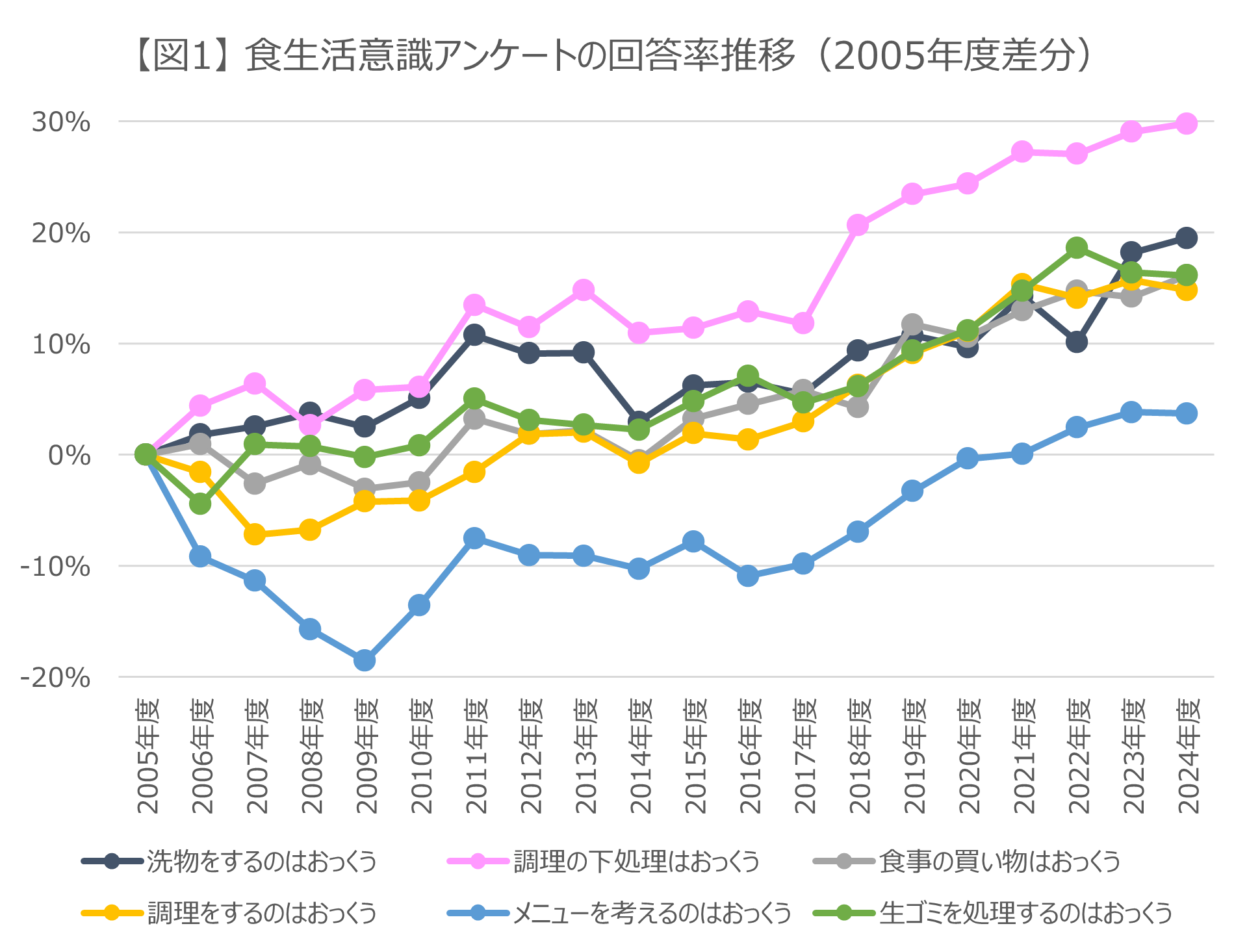 【図1】は、食生活に関する意識アンケートの回答率の推移を20年前の2005年度(4月~翌年3月)との差分で示したものです。