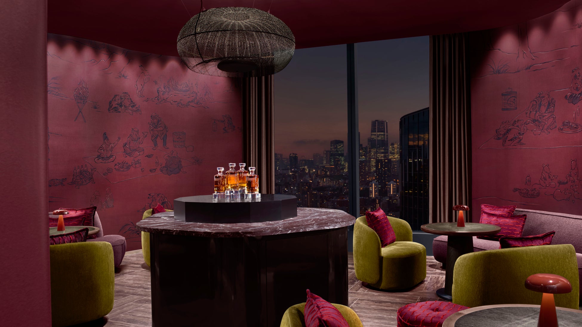 壁面には、日本最古の漫画として知られる国宝「鳥獣戯画」をモチーフにしたアートを大胆に配し、原作には登場しない大人の遊び心を感じさせる演出が施されています。
