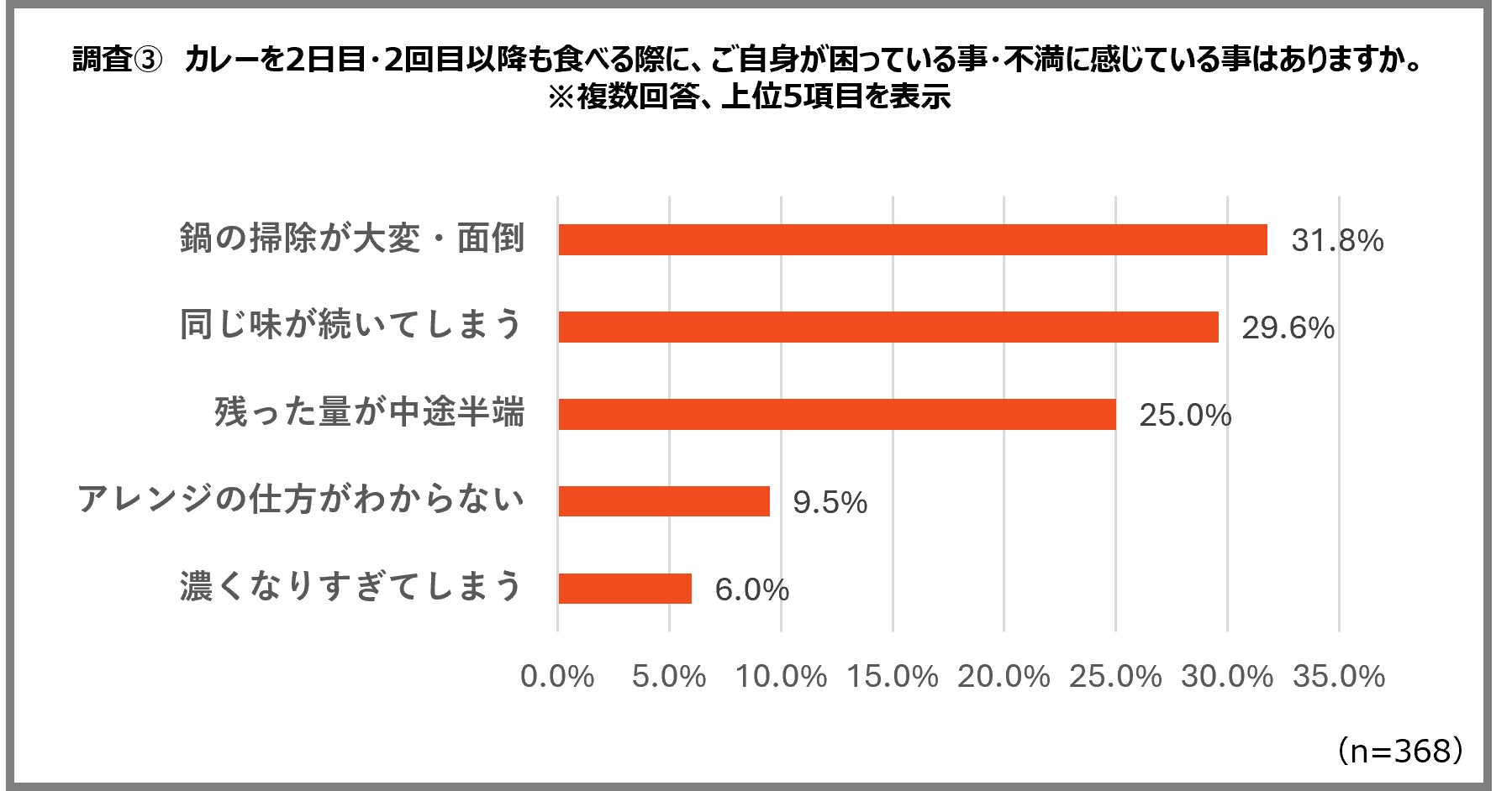 今回の調査では、多くの家庭が翌日以降の食事も見越してカレーを多めに調理している一方で、その「2日目以降のカレー」をめぐって、さまざまな悩みがあることが分かりました。中でも、「鍋の掃除が大変」「味のマンネリ」といった悩みが多く見受けられます。