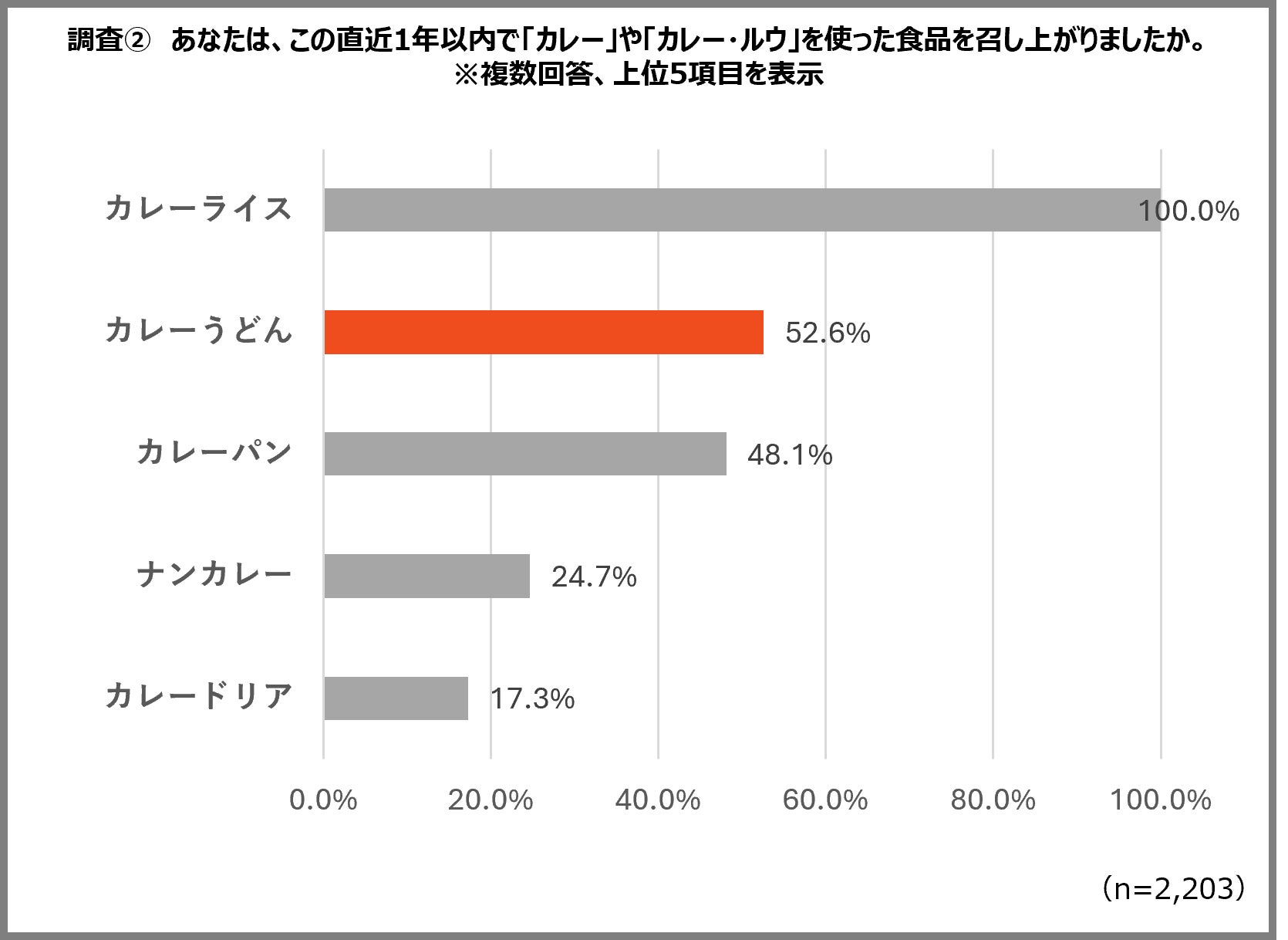 直近1年以内の「カレー」に関連する食品の喫食経験を調査したところ、王道の「カレーライス(100.0%)」に次いで、第2位にランクインしたのは「カレーうどん(52.6%)」でした。