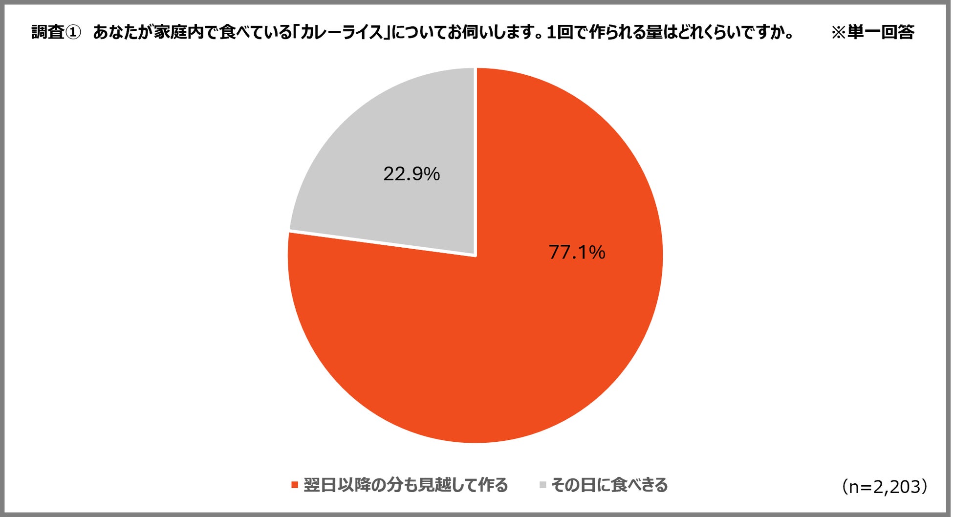 30〜40代子あり既婚・有職男女のうち、家庭内で最もよくカレーを作る人(n=2,203)を対象に調査したところ、77.1%が1回の調理で「翌日以降の分まで」を見越して多めに作っていることが分かりました。