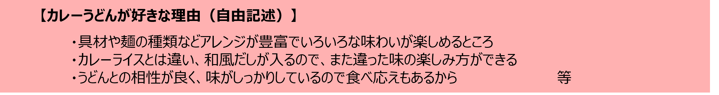 本調査の対象である「子育て世帯かつ料理を担当する30-40代」において、カレーうどんはカレー料理の中で、半数を超える高い喫食率であり、身近な選択肢であることがうかがえます。