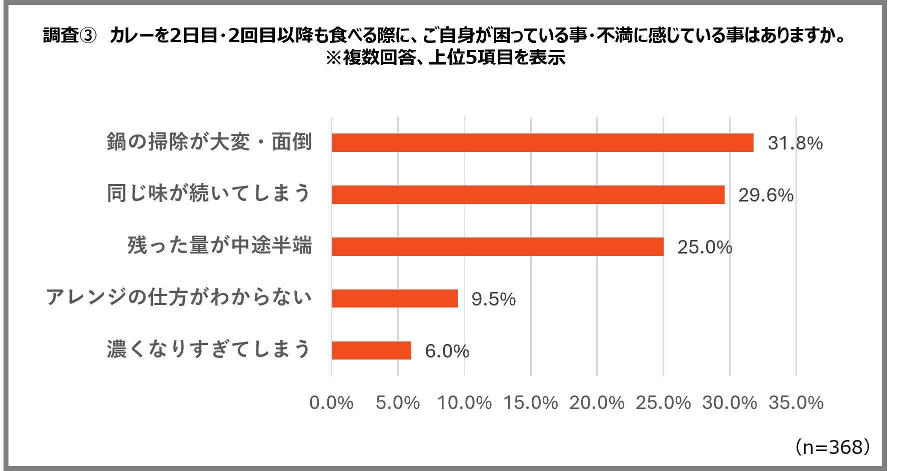 今回の調査では、多くの家庭が翌日以降の食事も見越してカレーを多めに調理している一方で、その「2日目以降のカレー」をめぐって、さまざまな悩みがあることが分かりました。中でも、「鍋の掃除が大変」「味のマンネリ」といった悩みが多く見受けられます。