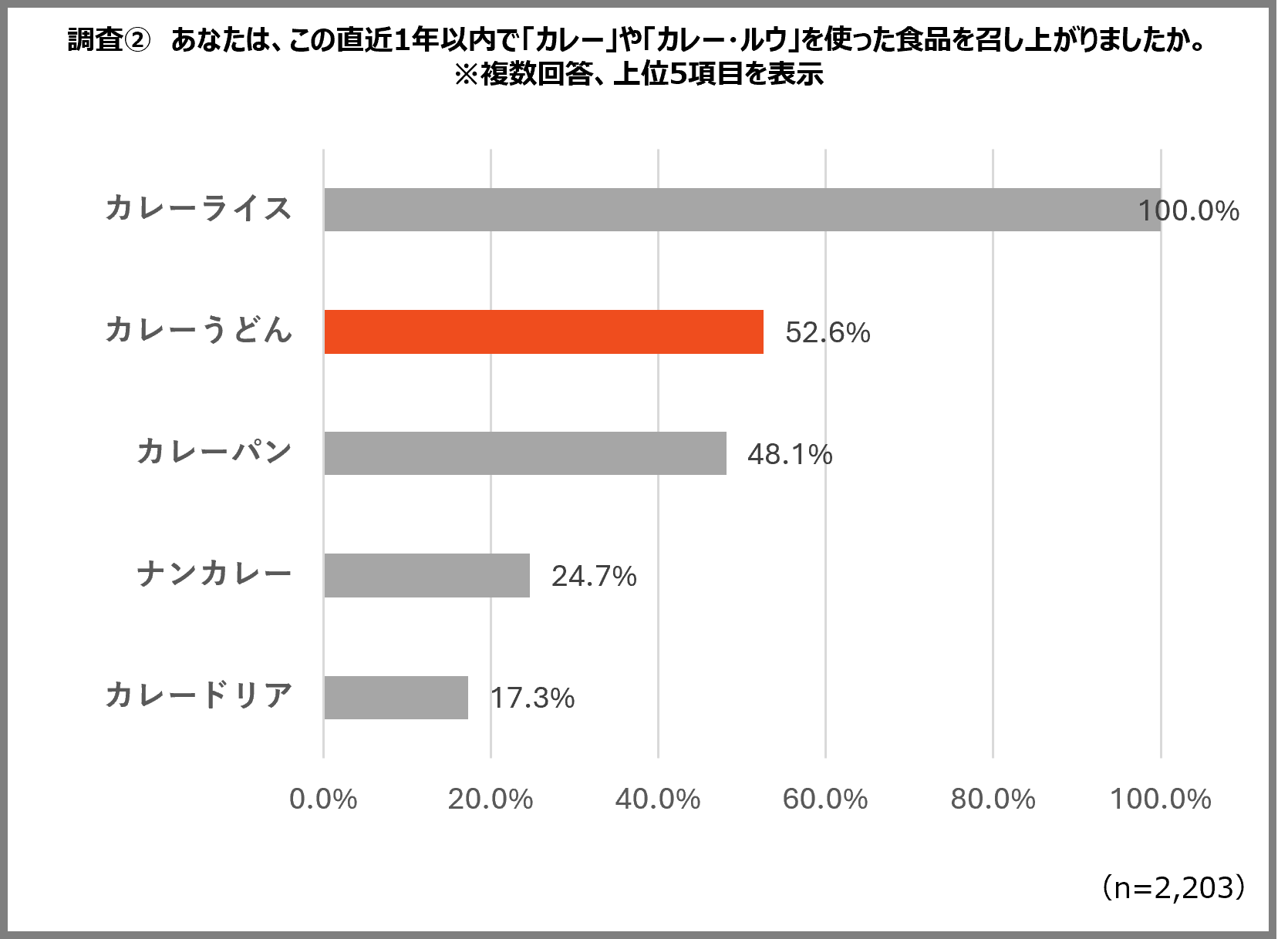 直近1年以内の「カレー」に関連する食品の喫食経験を調査したところ、王道の「カレーライス(100.0%)」に次いで、第2位にランクインしたのは「カレーうどん(52.6%)」でした。