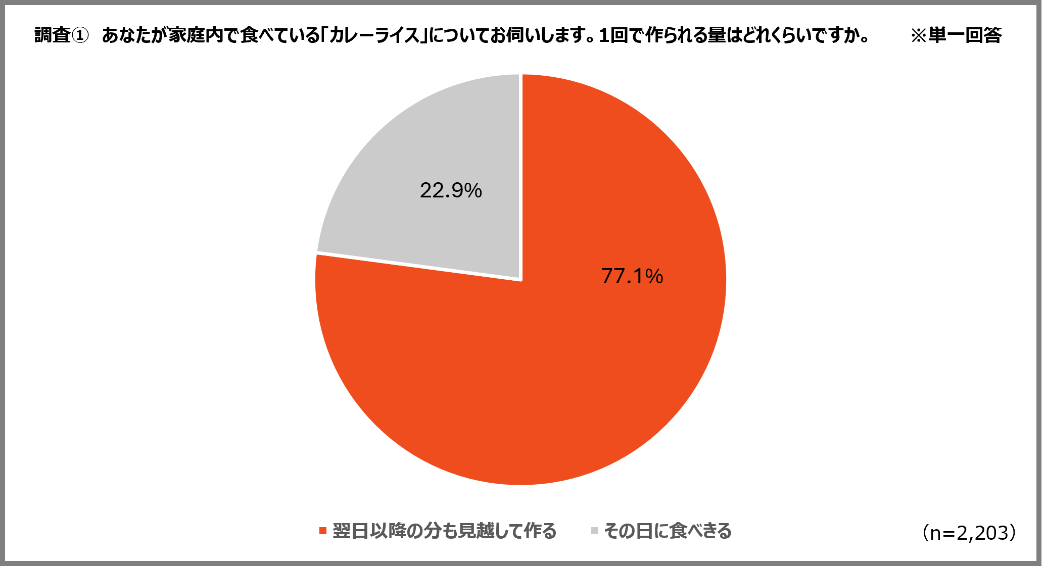 30〜40代子あり既婚・有職男女のうち、家庭内で最もよくカレーを作る人(n=2,203)を対象に調査したところ、77.1%が1回の調理で「翌日以降の分まで」を見越して多めに作っていることが分かりました。
