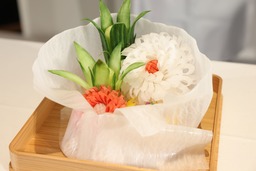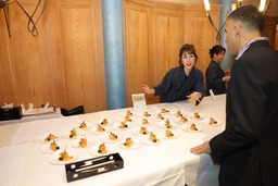 ダボス会議は、世界各国から著名な経営者や政治家、学識者が集う貴重な機会です。この機を捉え、 寿司職人による寿司握りの実演のほか、チューリッヒの和食レストラン「BIMI」(日本産食材サポーター店)の協力を得て、日本人和食料理人による国産の農林水産物・食材の魅力を生かした料理を提供し、各国のゲストに日本のさまざまな食文化を楽しんでいただきました。具体的には、和牛を使ったローストビーフ、すき焼きなどの温かい料理や、ブリ・ホタテなど素材の味を生かした海鮮料理、また、粘りがあり、冷めてもおいしい日本産米の特徴を生かしたおにぎりなども提供しました。さらに、今年は京都の割烹・懐石料理店「水簾」総料理長による、日本の食文化の紹介と、伝統的な包丁技法である「かつらむき」を実演。華麗な包丁さばきによって完成した美しい飾り包丁作品に、ゲストは拍手を送り、会場を盛り上げました。 2026年は東日本大震災の発災から15年という節目の年でもあり、福島県産の桃ジュースや県産酒も用意するなど、日本国内のさまざまな地域の食文化・魅力を堪能いただく機会となりました。